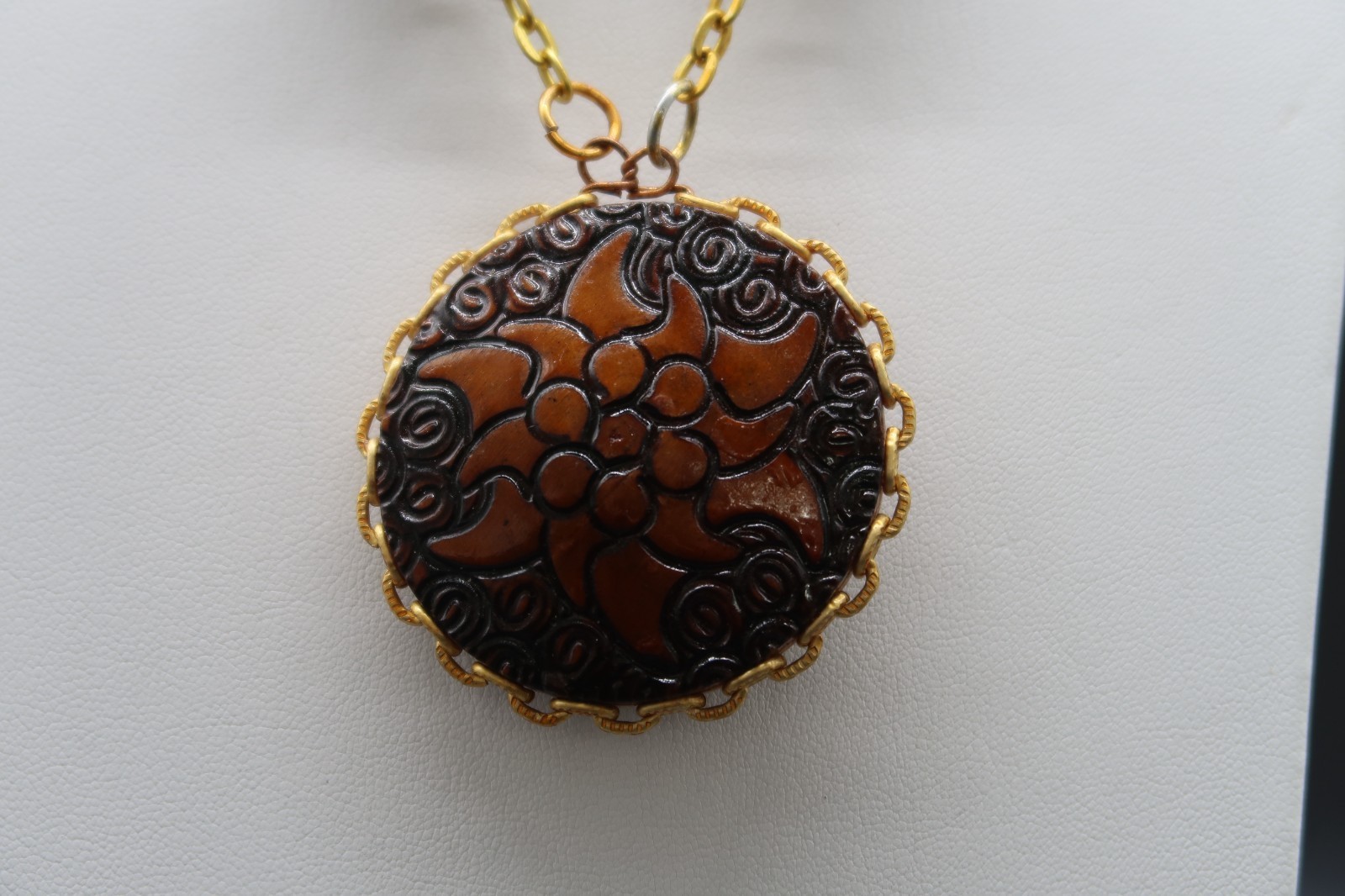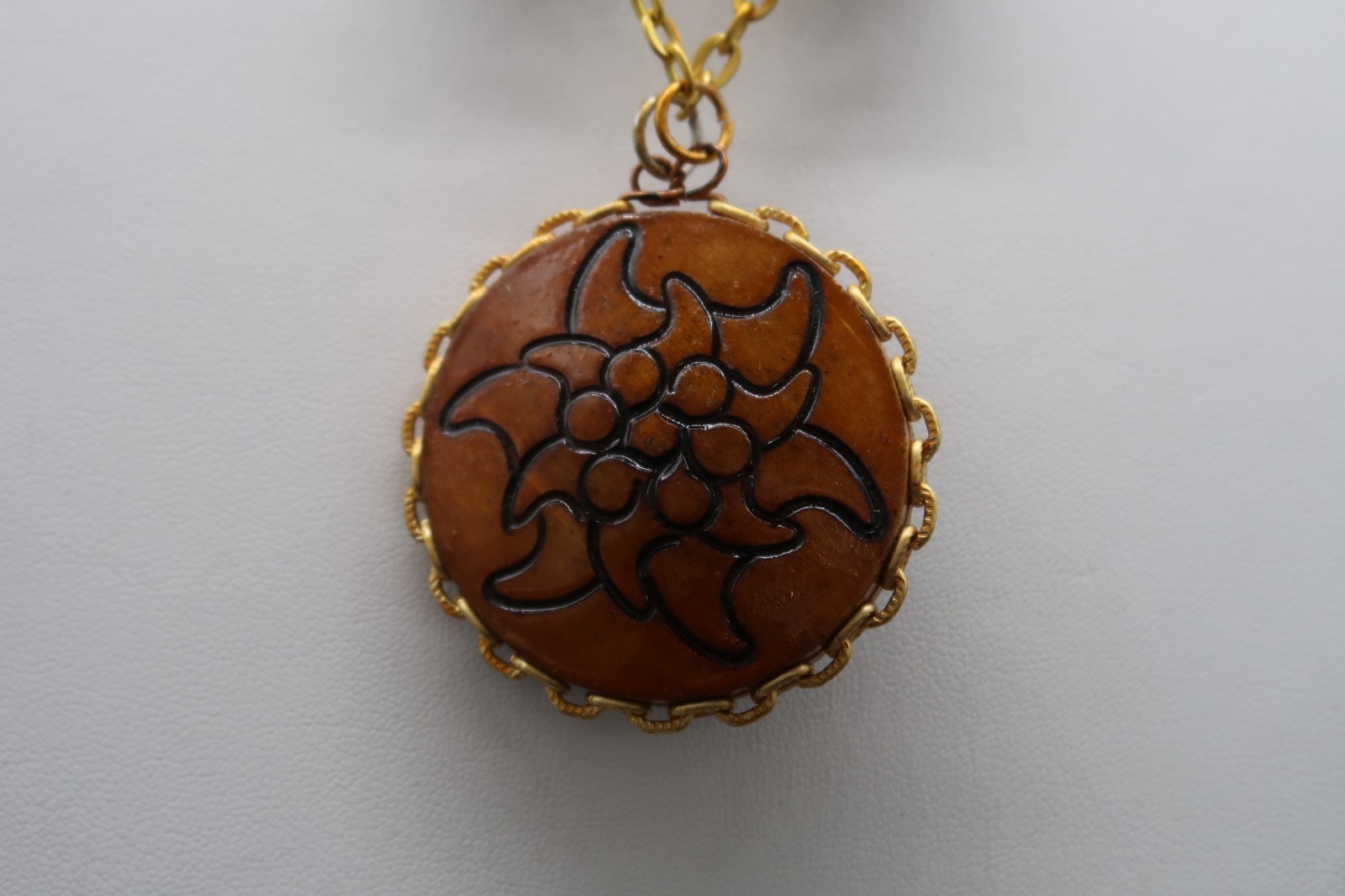 Vintage Double Sided Hand Burned Design Wood Medallion Pendant Necklace