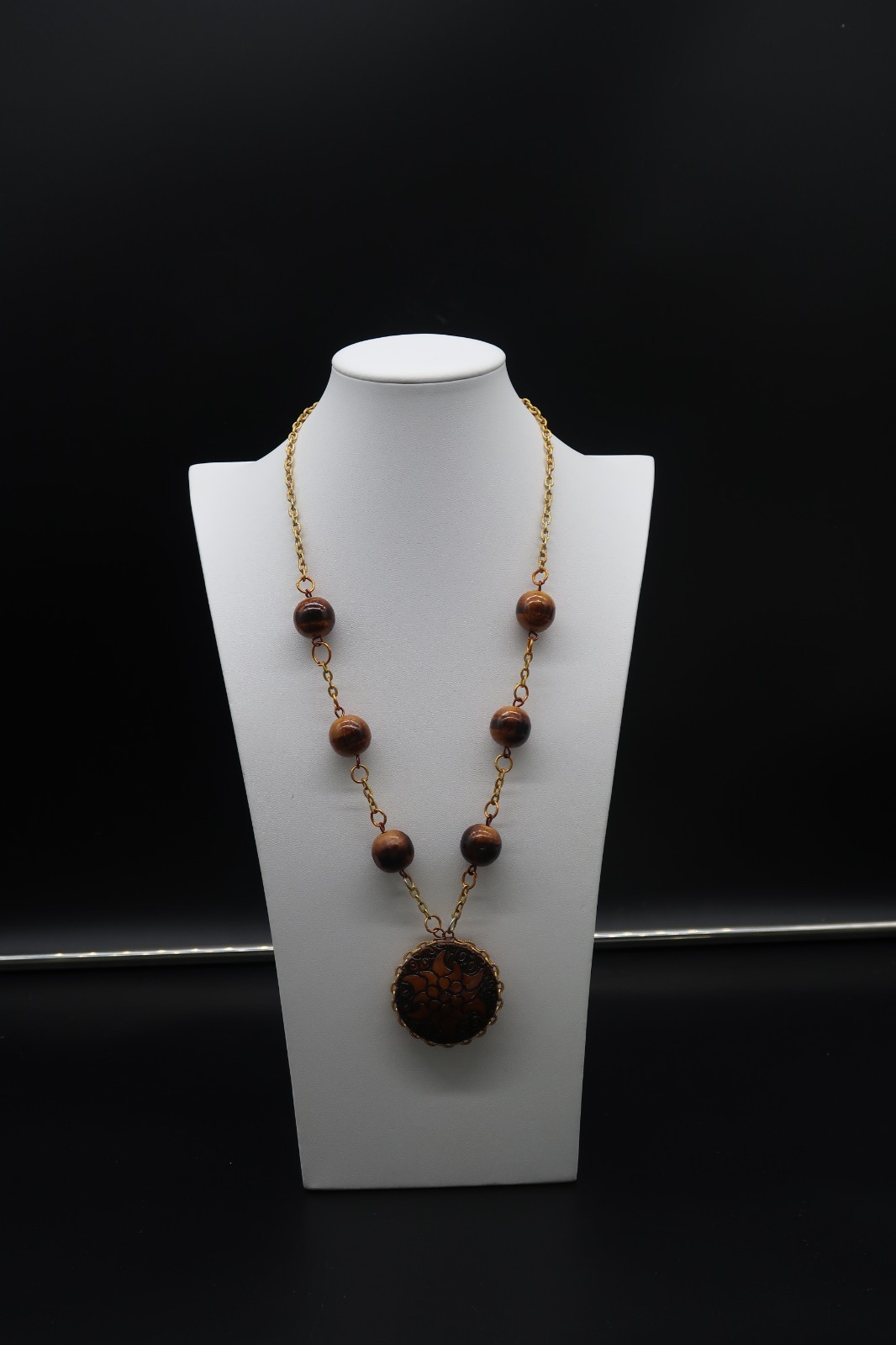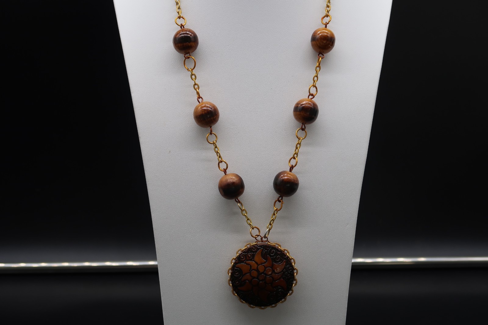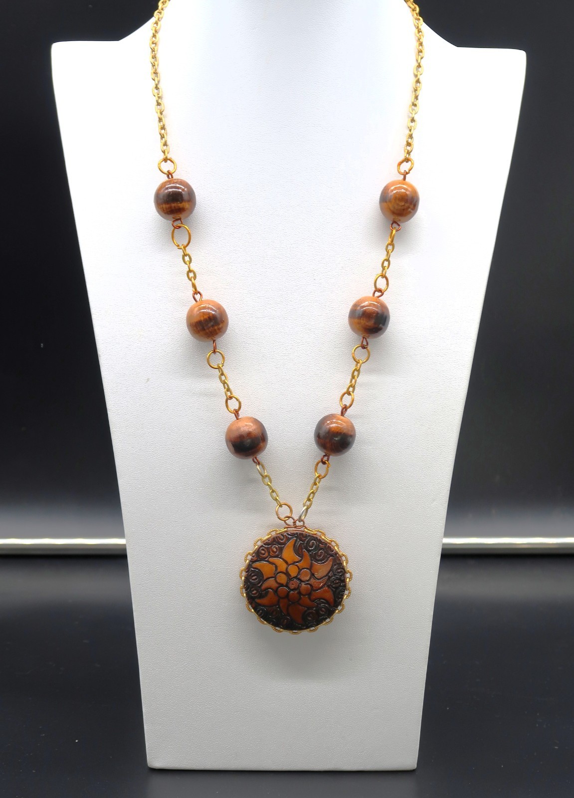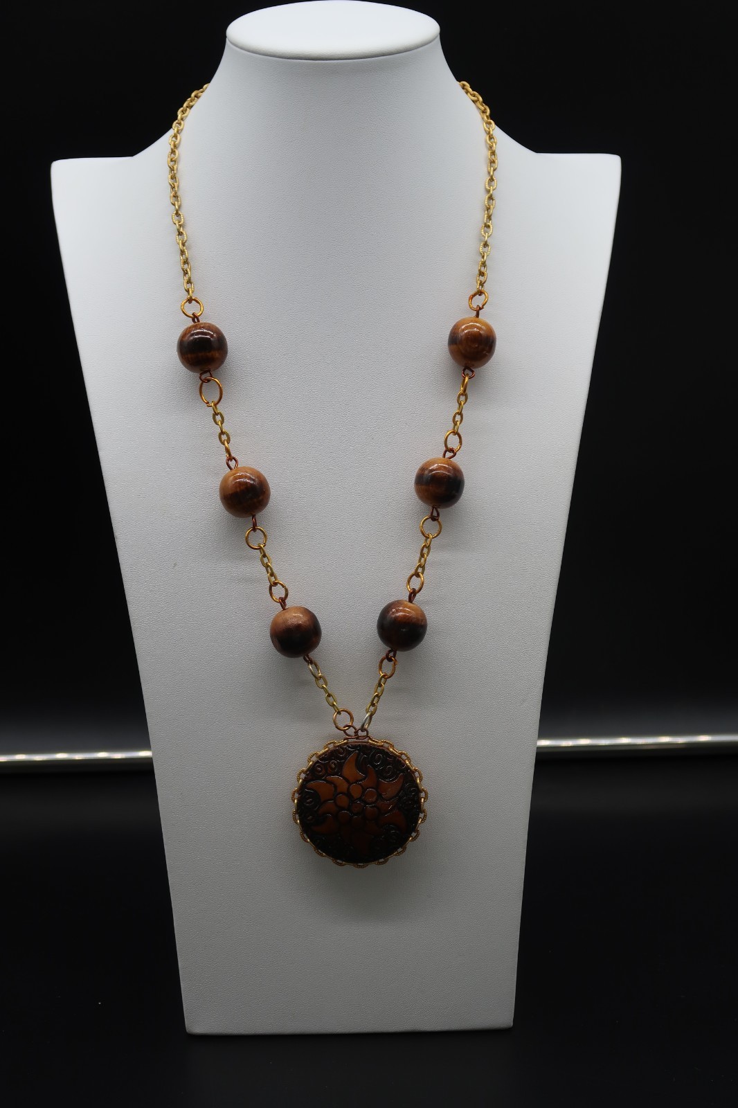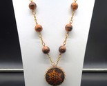 Primary image for Vintage Double Sided Hand Burned Design Wood Medallion Pendant Necklace