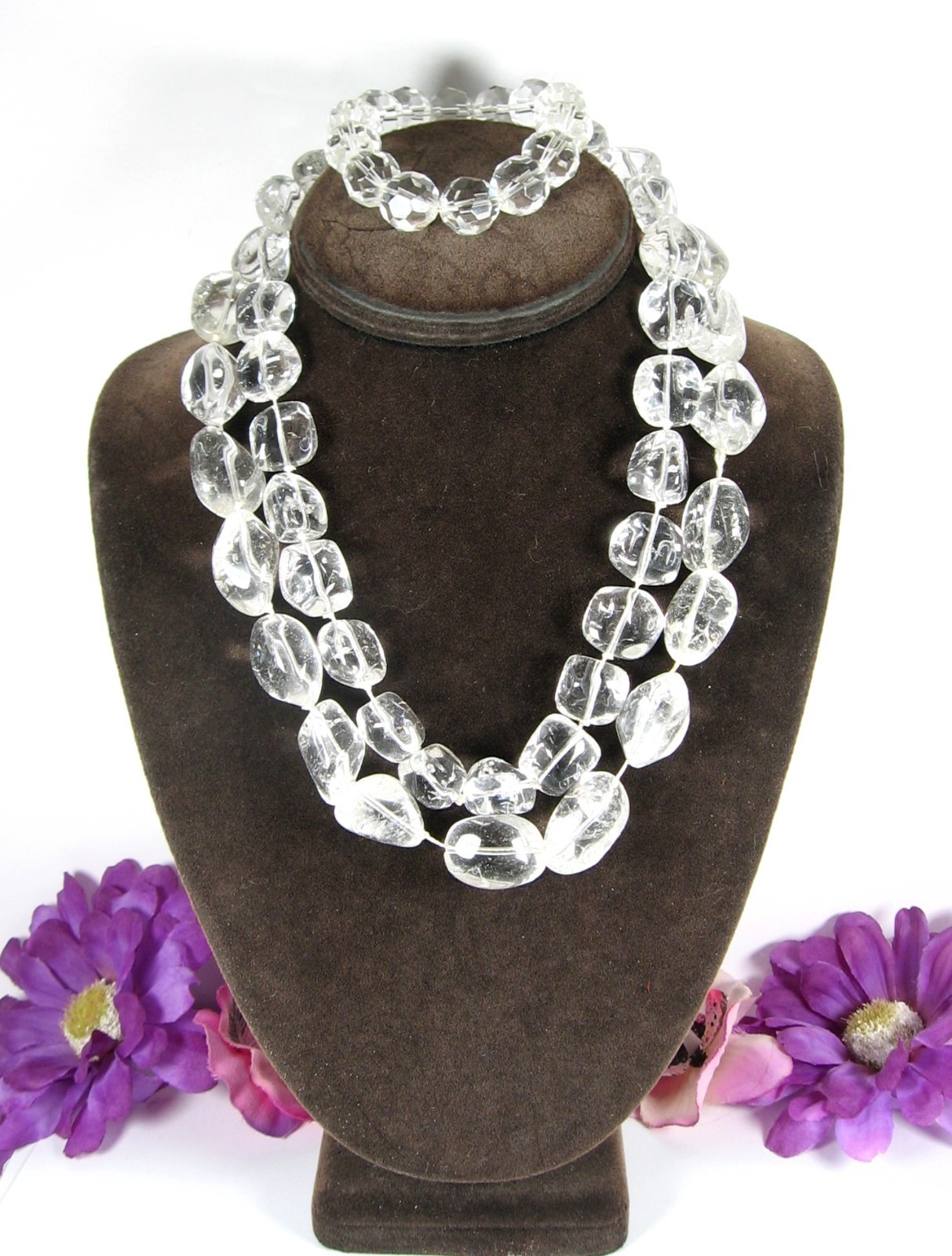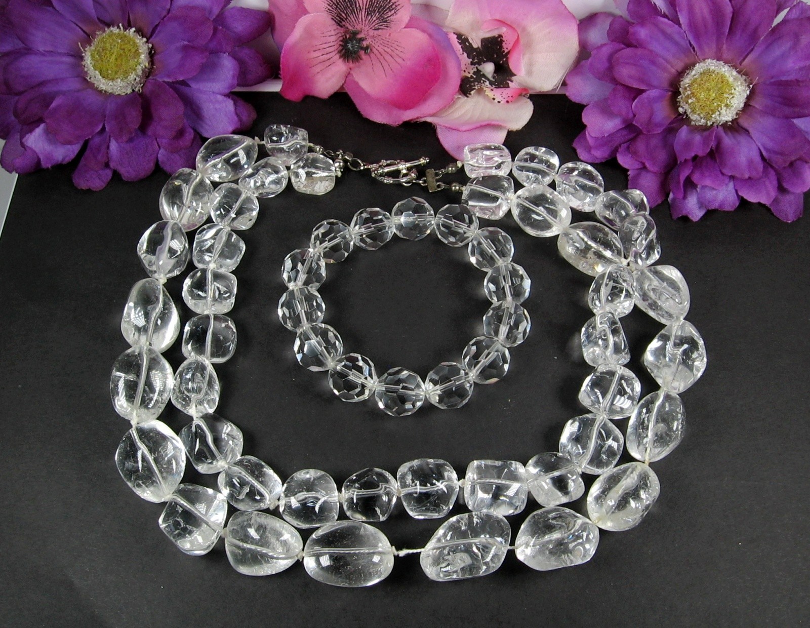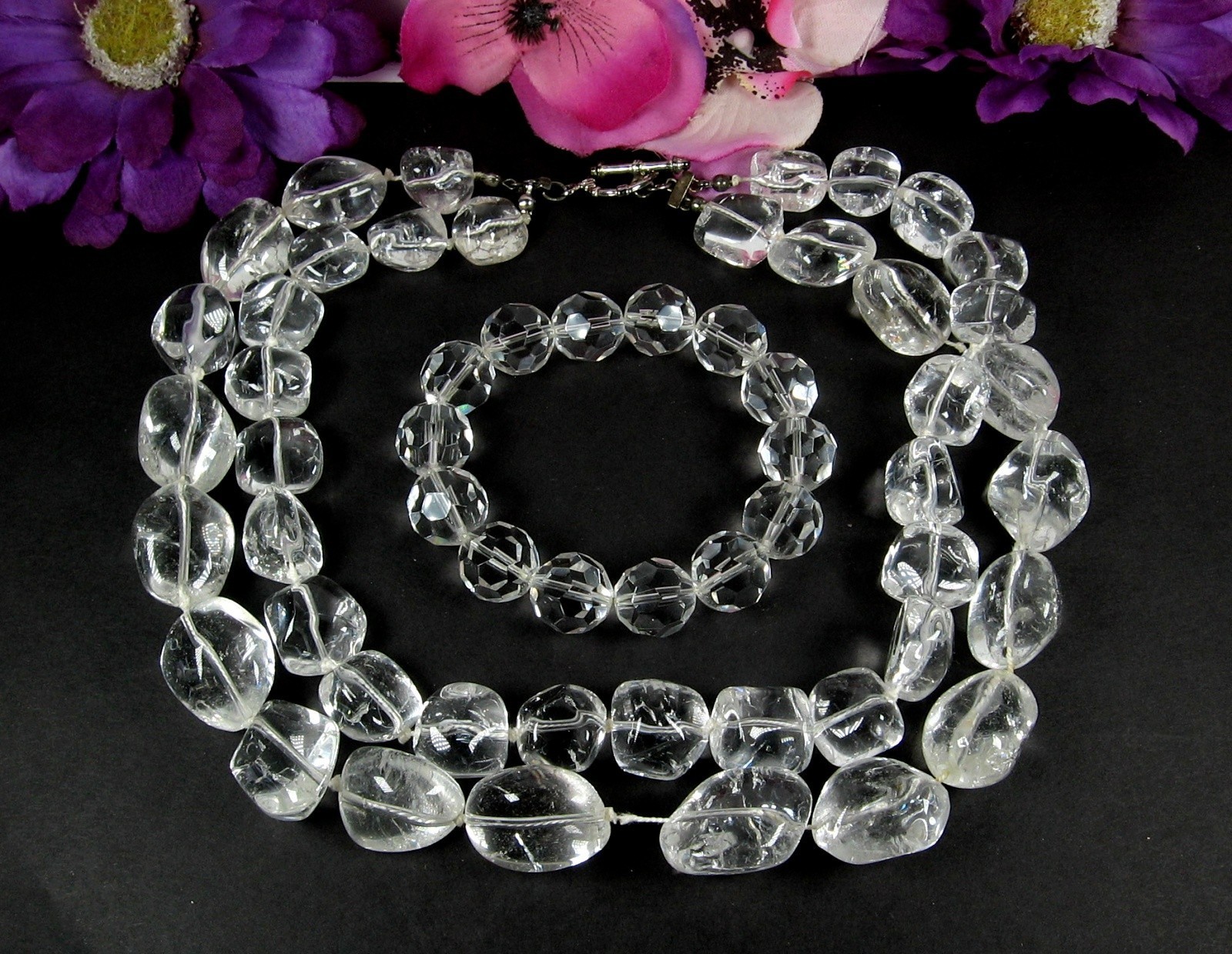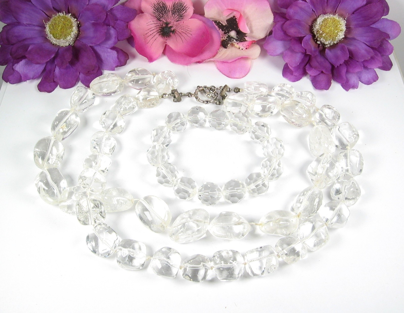 Vintage Double Strand CLEAR GLASS ICE NUGGETS Beads Plus Beaded BRACELET 18" This is a vintage CLEAR GLASS BEADED DOUBLE STRAND NECKLACE PLUS A BRACELET! While not an exact match, both of these vintage pieces have CLEAR GLASS BEADS! The necklace has glass beads that are chunky, rounded and all different sizes and shape. It is a heavy necklace with a toggle clasp. The bracelet has round faceted clear glass beads strung on an elastic stretchy string. Although not an exact match they would look great together! CRYSTAL CLEAR VINTAGE ICE! MATERIAL: Glass METAL: Silvertone CLASP: Necklace has a Toggle clasp, Bracelet is strung on elastic stretch cording MEASUREMENTS: Necklace length is 18" and the Bracelet measures 6" unstretched CONDITION: These pieces of jewelry are in pre-owned and vintage used condition. The clasp is in full working order. The bracelet's elastic stretches as expected. The beads on the necklace have some play along the string which is showing wear and it may have to be restrung at some point. There is scratching and finish wear present. mrzipmdo Just Jewelry by MrZipMDO