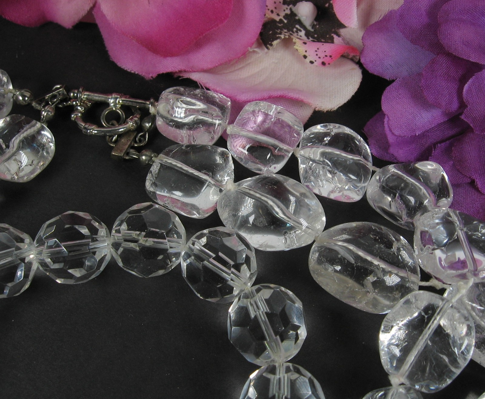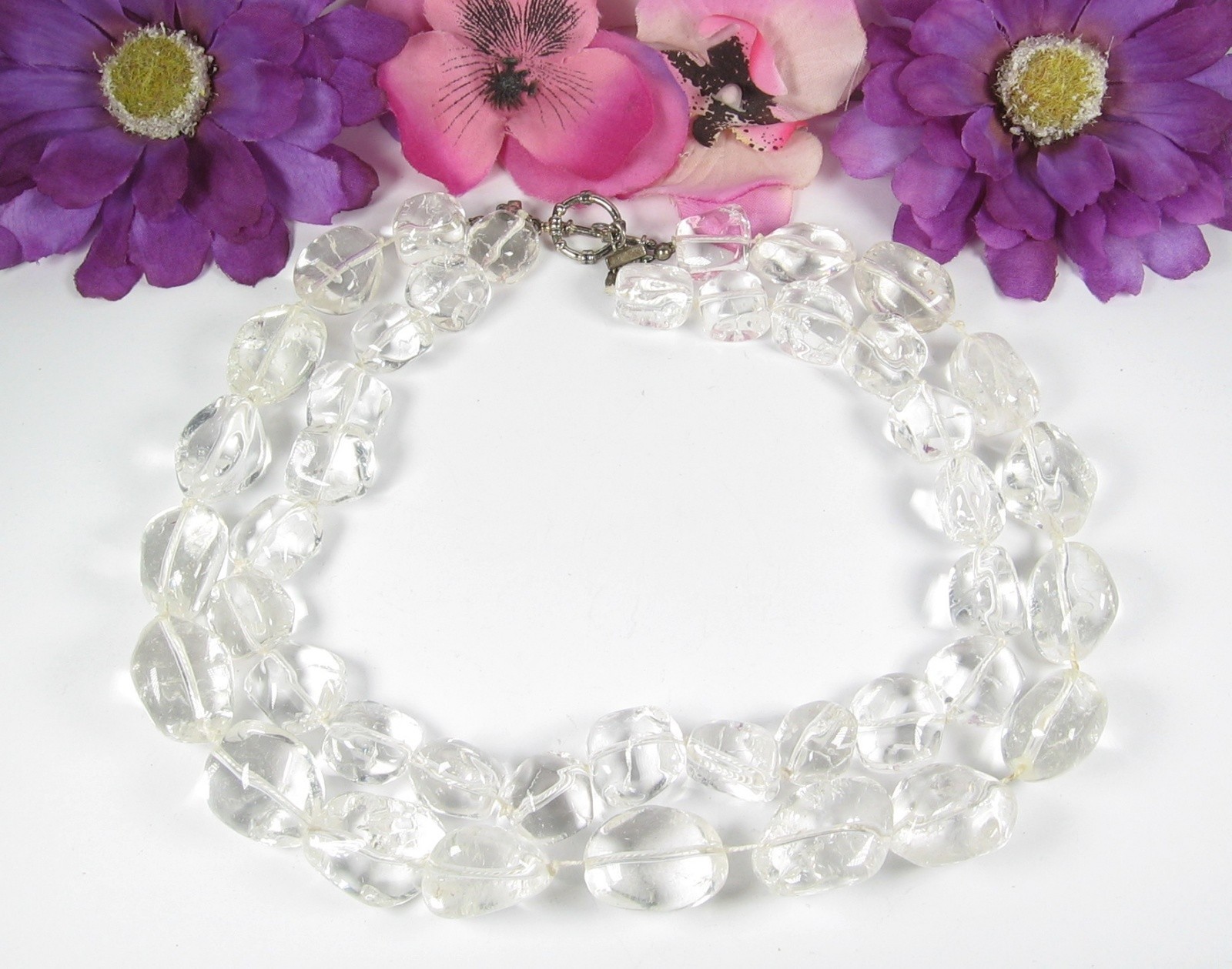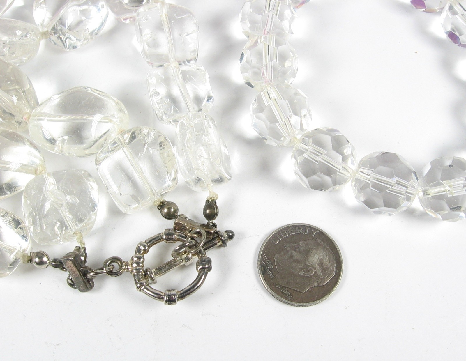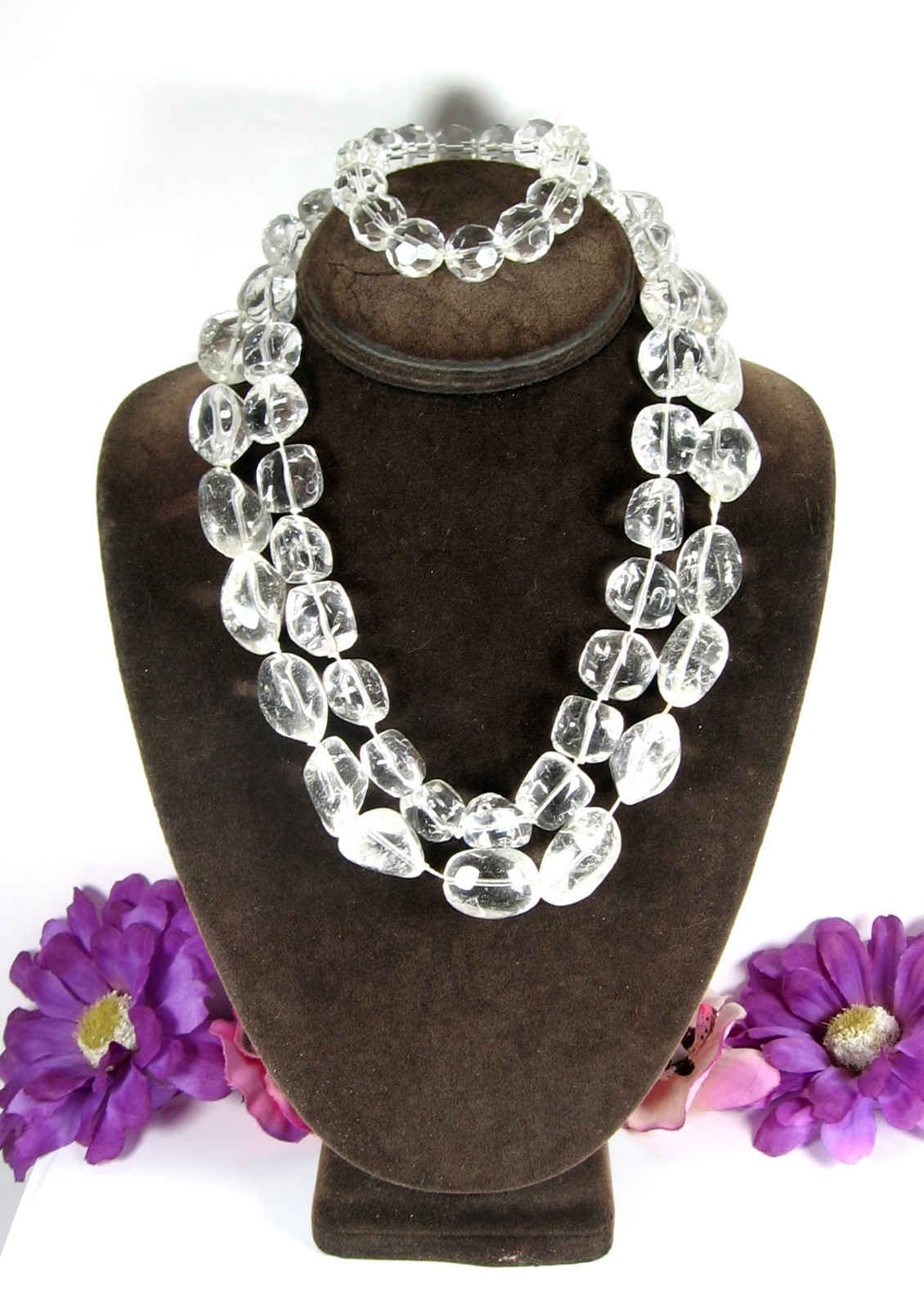 Vintage Double Strand CLEAR GLASS ICE NUGGETS Beads Plus Beaded BRACELET 18" This is a vintage CLEAR GLASS BEADED DOUBLE STRAND NECKLACE PLUS A BRACELET! While not an exact match, both of these vintage pieces have CLEAR GLASS BEADS! The necklace has glass beads that are chunky, rounded and all different sizes and shape. It is a heavy necklace with a toggle clasp. The bracelet has round faceted clear glass beads strung on an elastic stretchy string. Although not an exact match they would look great together! CRYSTAL CLEAR VINTAGE ICE! MATERIAL: Glass METAL: Silvertone CLASP: Necklace has a Toggle clasp, Bracelet is strung on elastic stretch cording MEASUREMENTS: Necklace length is 18" and the Bracelet measures 6" unstretched CONDITION: These pieces of jewelry are in pre-owned and vintage used condition. The clasp is in full working order. The bracelet's elastic stretches as expected. The beads on the necklace have some play along the string which is showing wear and it may have to be restrung at some point. There is scratching and finish wear present. mrzipmdo Just Jewelry by MrZipMDO