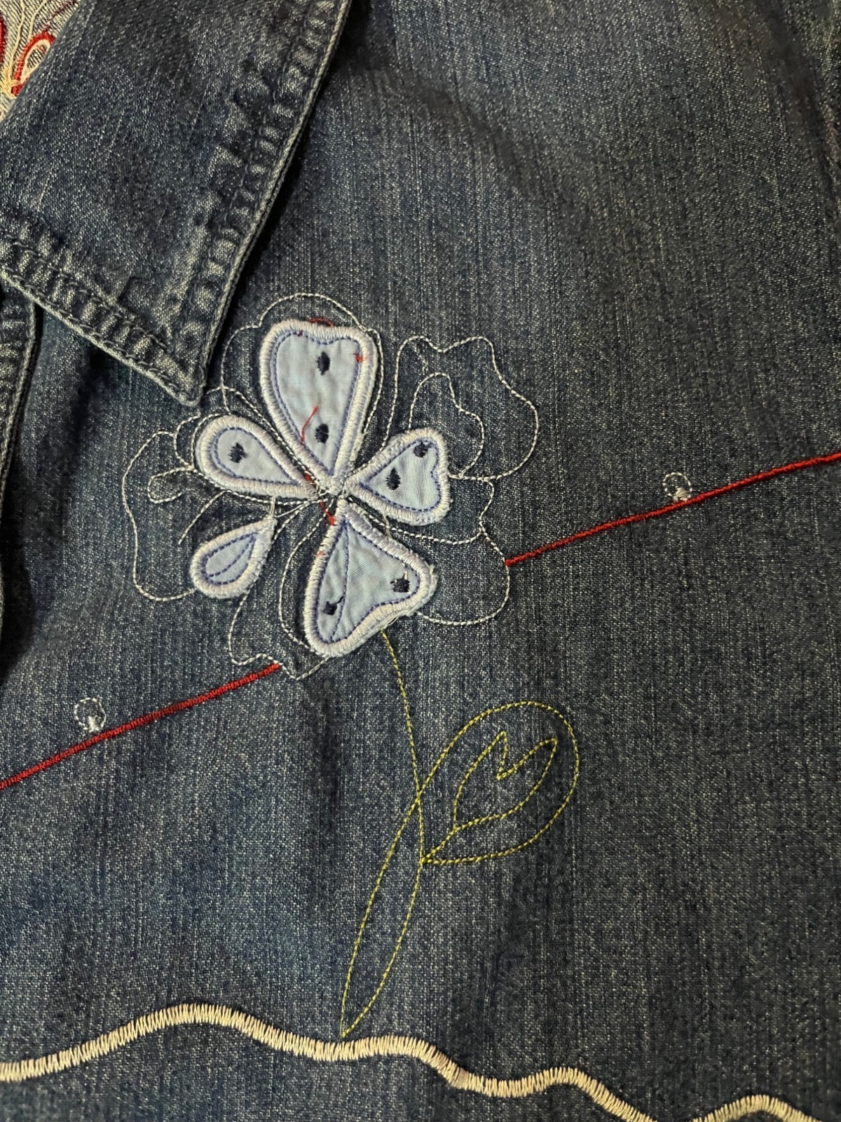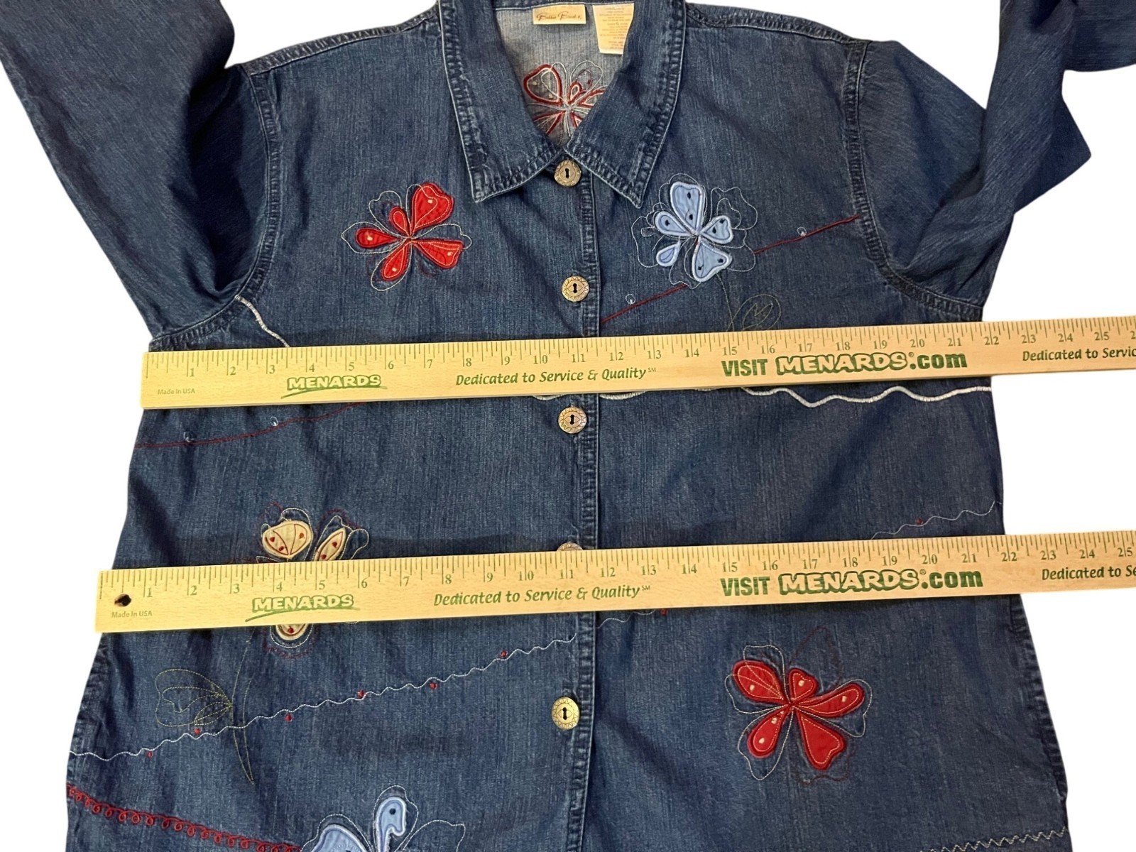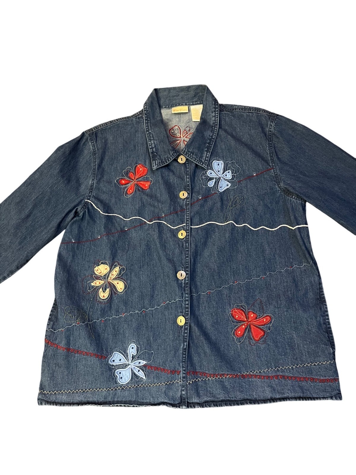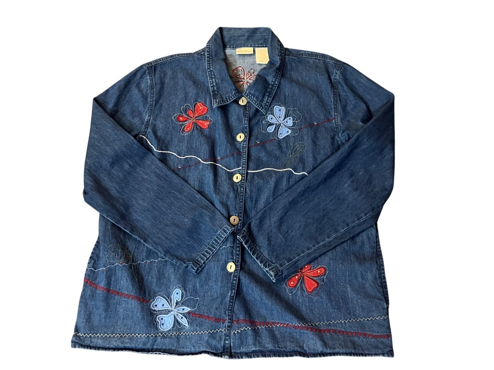 Charming Bobbie Brooks denim shacket with embroidered and applique flowers on the front and collar, plus a small accent flower on the back. Great for layering in fall or spring.