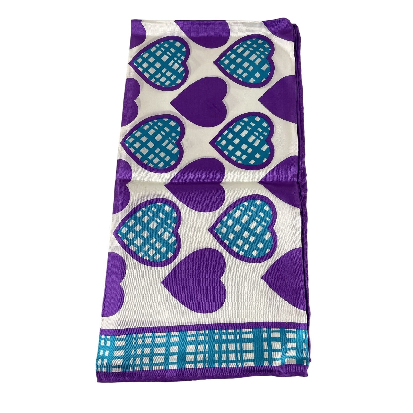 #1233 Vintage Echo Silk Azlon NOS Scarf Hearts Purple Turquoise Tags in Original Bullocks Gift Box. 1970's. This was found in the box and never touched until now. Always consider offers. 27" x 27" size
