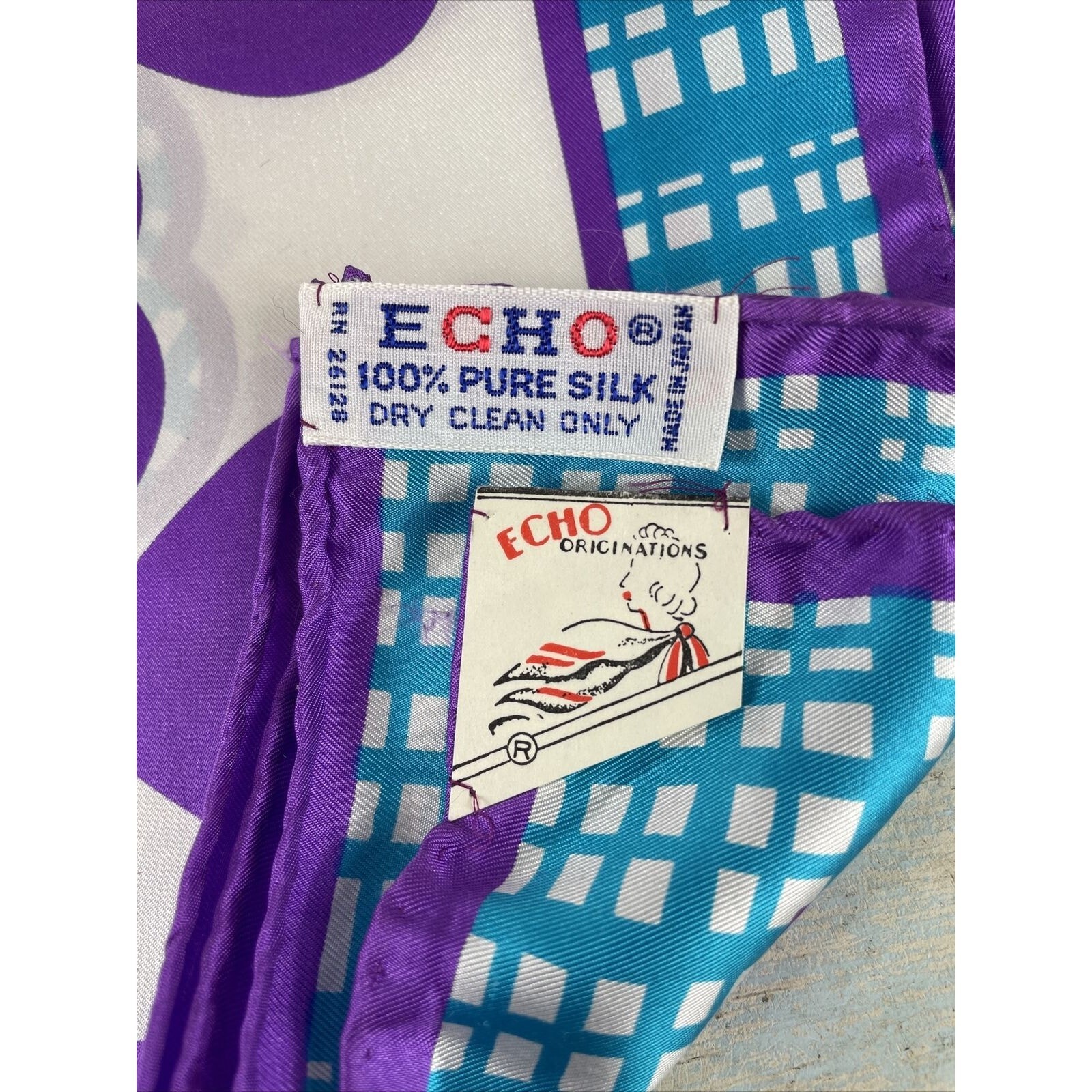 This vintage Echo silk scarf is a stunning find, featuring a beautiful hearts design in vibrant purple and turquoise tones. New old stock (NOS), this scarf is in pristine condition and perfect for adding a pop of color to any outfit. Its luxurious silk fabric and timeless design make it ideal for fashion enthusiasts, collectors, or anyone who appreciates high-quality accessories.
