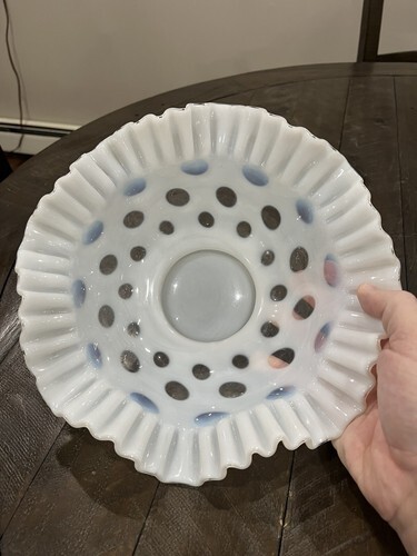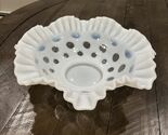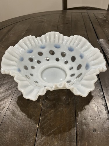 - Vintage Fenton White Opalescent Coin Dot Crimped Ruffle Console Bowl 10.25”