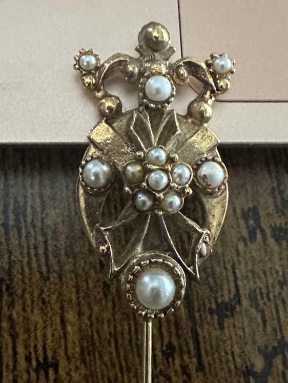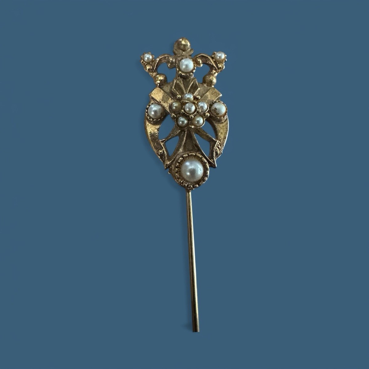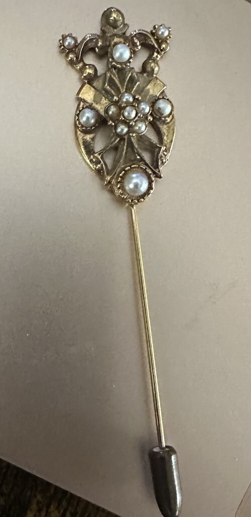 Vintage Florenza Faux Pearl Crown Straight Stick Pin Gold Tone hat pin