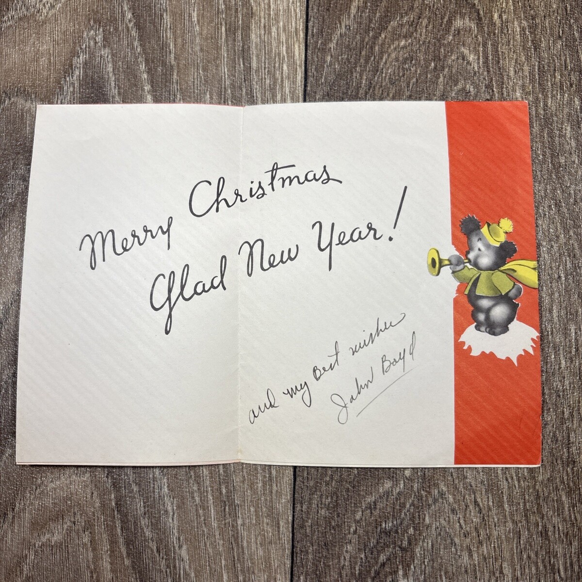 The Vintage Folded Christmas Holiday Card features a charming design of a bear dressed in a hat and scarf, expressing a heartfelt sentiment of "What My Wish Will Be." This collectible paper greeting card captures the essence of Christmas, making it a unique and nostalgic addition to any holiday card collection.