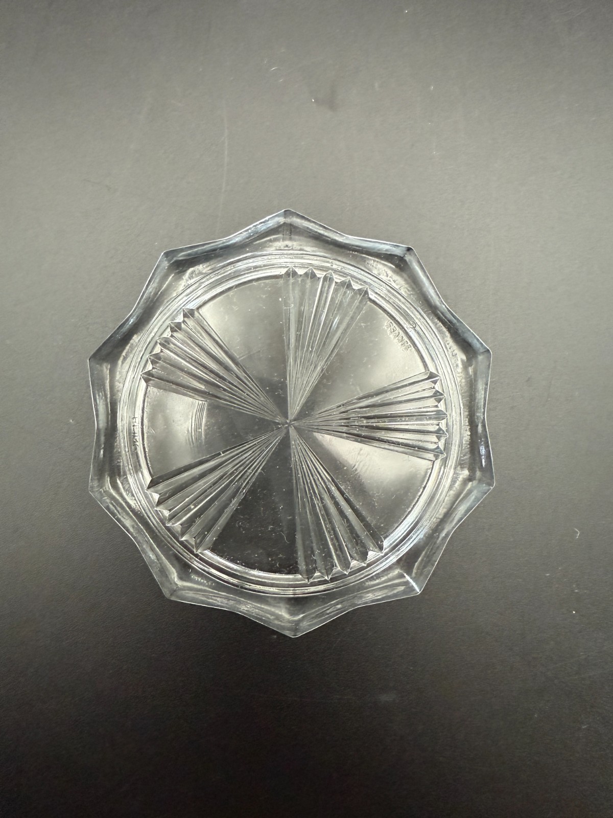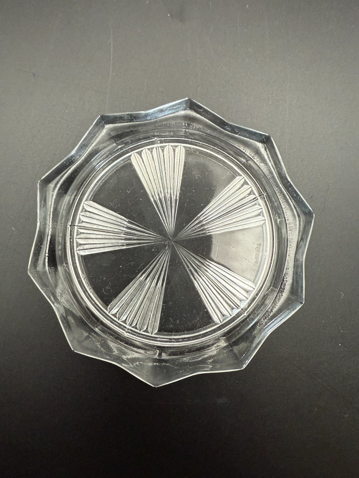 pressed glass coasters, each featuring a radiant starburst pattern and