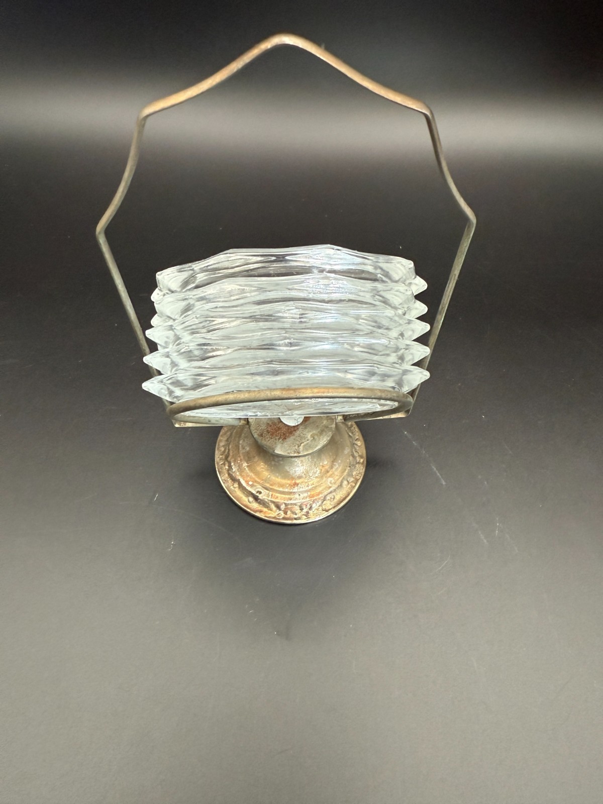a silver-tone metal holder with ornate detailing, adding a touch of