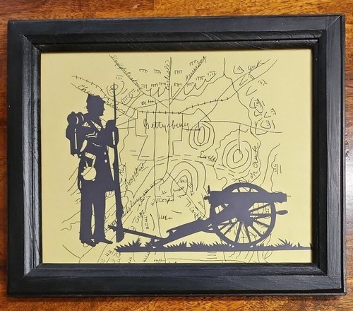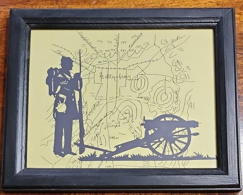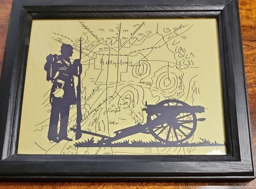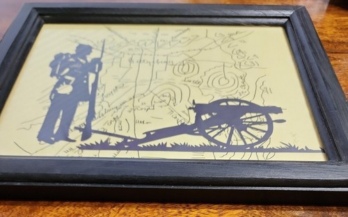 This sale is for One (1) Vintage Framed Silhouette Print A map of Gettysburg for a background with a silhouette of a Confederate Soldier holding a long rifle behind a cannon Wooden frame in black Framed print measures approximately 9.5" tall x 11.5" wide X .75" deep Sawtooth hanger on backside for display Print frame are in good ~ vintage ~ pre-owned condition Please view photos for a good description of this framed print Thank you!