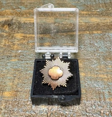 Authentic Girl Scout Bronze Award pin, the highest honor a Junior Girl Scout can earn. This vintage version features the classic bronze-tone sunburst design with the iconic trefoil center. Comes in a clear plastic display box with velvet pad. Details: ? Original Girl Scouts of the USA Bronze Award pin ? Era: Vintage (likely 1980s?1990s) ? Material: Bronze-tone metal ? Includes protective display box ? Excellent condition ? minimal wear, strong clasp ? A meaningful collectible for Girl Scout alumni, leaders, or display collections of scouting memorabilia.
