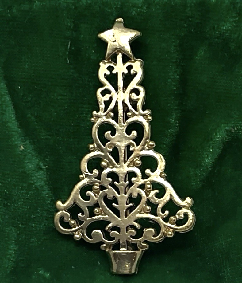 Celebrate the season with this beautifully crafted vintage Christmas tree brooch. Gold-tone pin showcases intricate filigree work that adds depth and elegance to its festive silhouette.