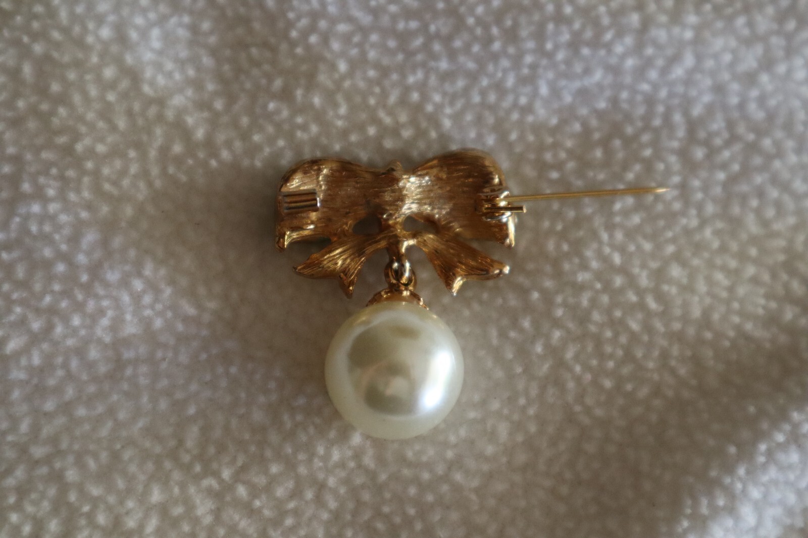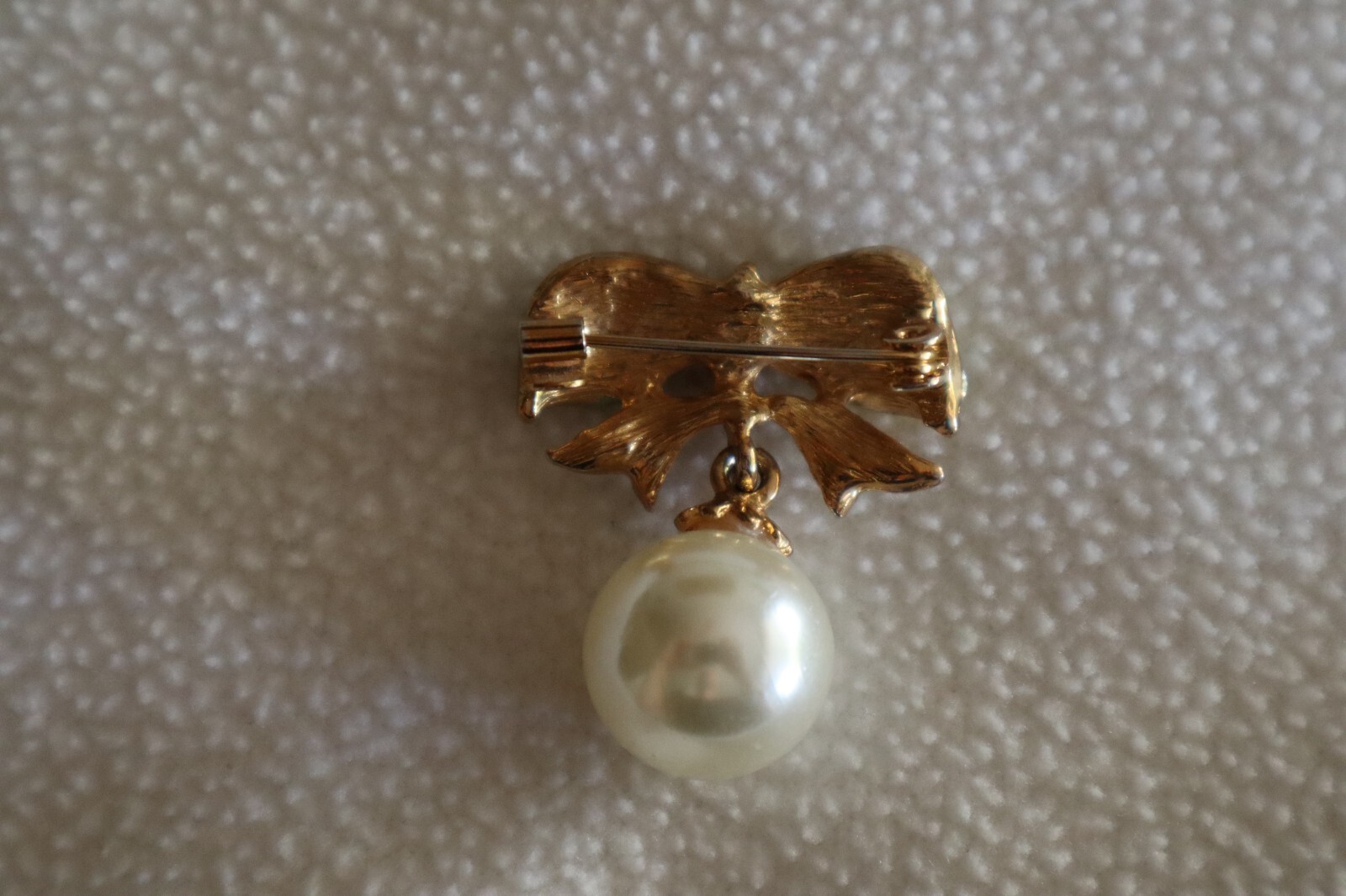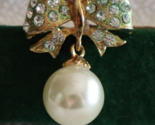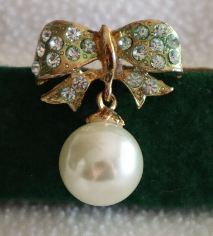 - Vintage Gold Tone Large Dangle Faux Pearl Bow Ribbon Brooch Greenish Hue 1.4"