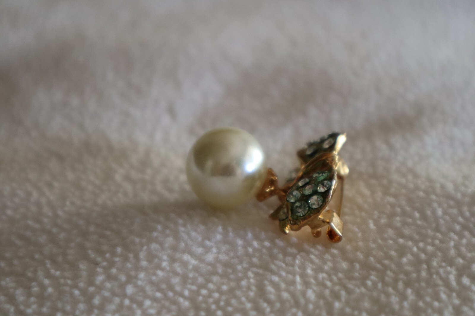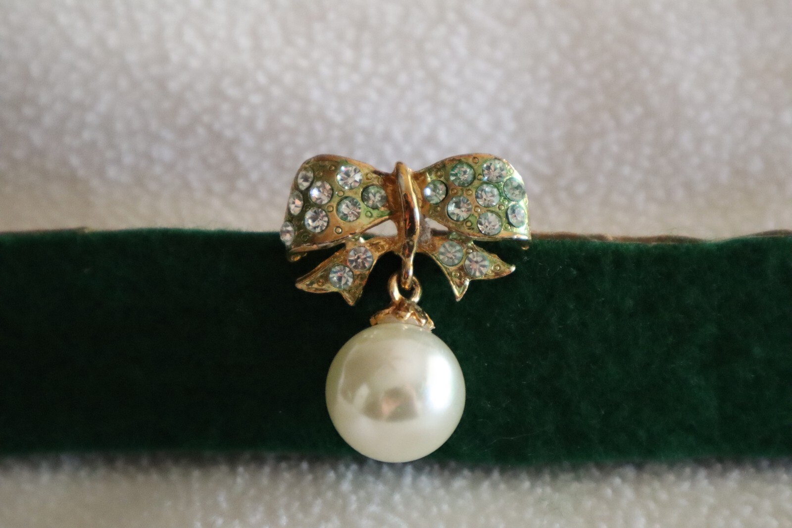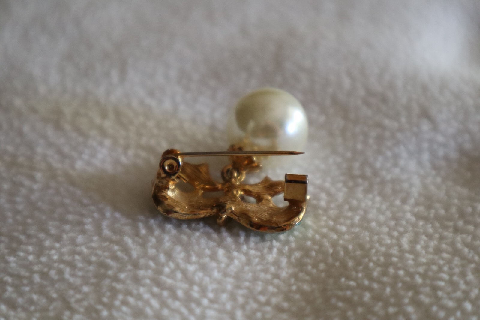 - Vintage Gold Tone Large Dangle Faux Pearl Bow Ribbon Brooch Greenish Hue 1.4"