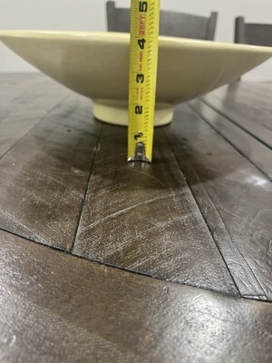 This Vintage Haeger Pottery Bowl 3295 in soft yellow is a stunning piece of mid-century modern decor. Made in the USA in 1985, this ceramic and porcelain bowl features a glossy finish and an impressed backstamp. With dimensions of 14" in length and height, and weighing 5 pounds, this original vintage piece is perfect for displaying table fruits or as a centerpiece in any room. The soft yellow color adds a touch of warmth and nostalgia to any space, making it a unique and stylish addition to your collection.
