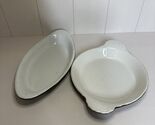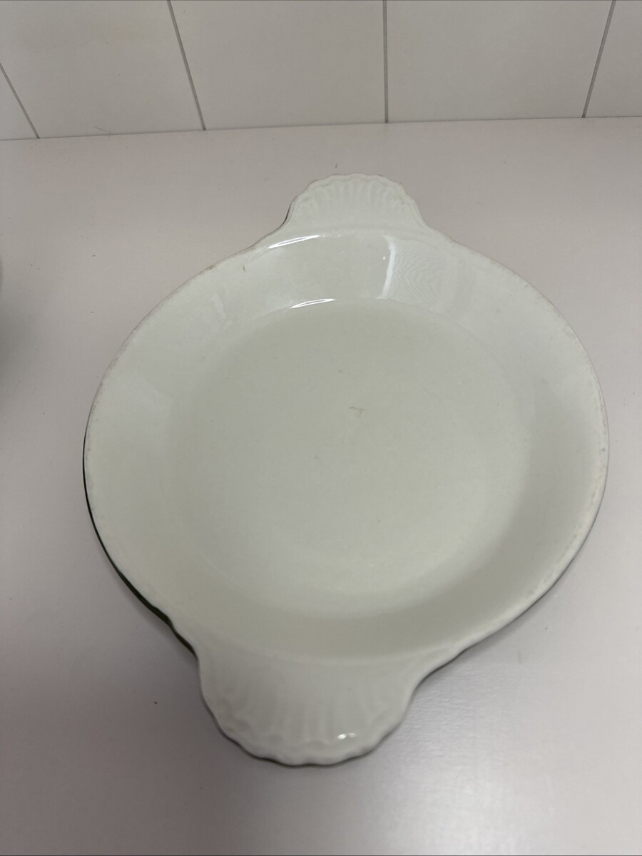 The Vintage Hall 435 522 Olive Green Baking Dishes are a set of 2 small stoneware baking dishes made in the USA. These round and oval shaped dishes are crafted with a classic olive green color, perfect for adding a touch of vintage charm to your kitchen. The set includes one round and one oval baking dish, each with a single compartment, ideal for baking and serving a variety of dishes. Proudly made by Hall in the United States, this set is a timeless addition to any kitchen collection.