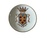 Vintage hand-painted Italian decorative plate featuring the historic Medici family coat of arms. The crest and gold rim are delicately painted, with ?Medici? and ?Italy? handwritten on the back in cursive. Likely mid-20th century artisan piece made for the Florentine market.