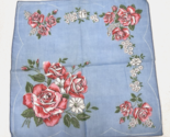 Primary image for Vintage Hankie Pink Roses White Flowers on Soft Blue  12 Inch