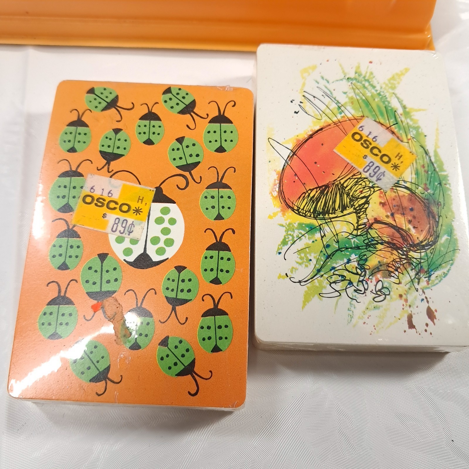 Vintage Happy Mushrooms ladybug Playing Cards Deck Trump Brand deck holder Includes 2 sealed decks of cards. Orange card holder is plastic and has a crack at the edge as shown. The holder is originally from the Tryce game, but the colors match the cards.