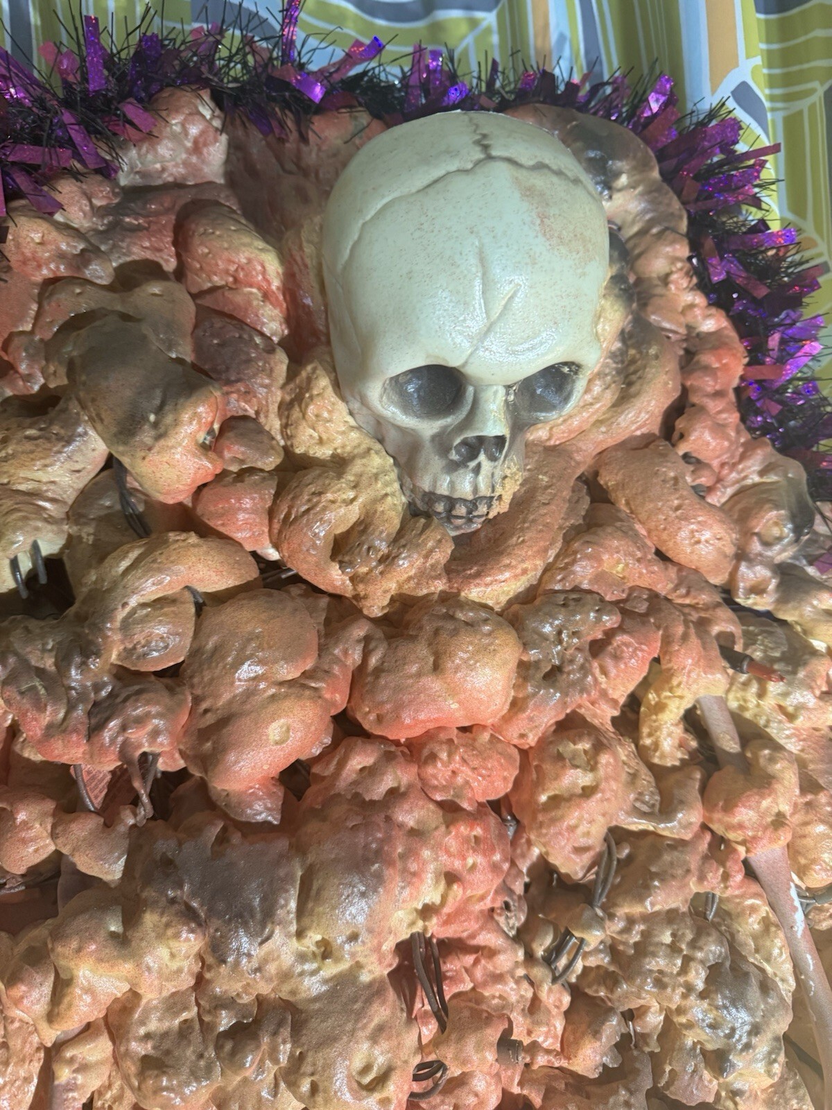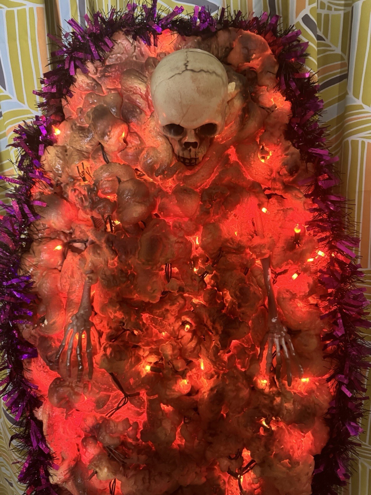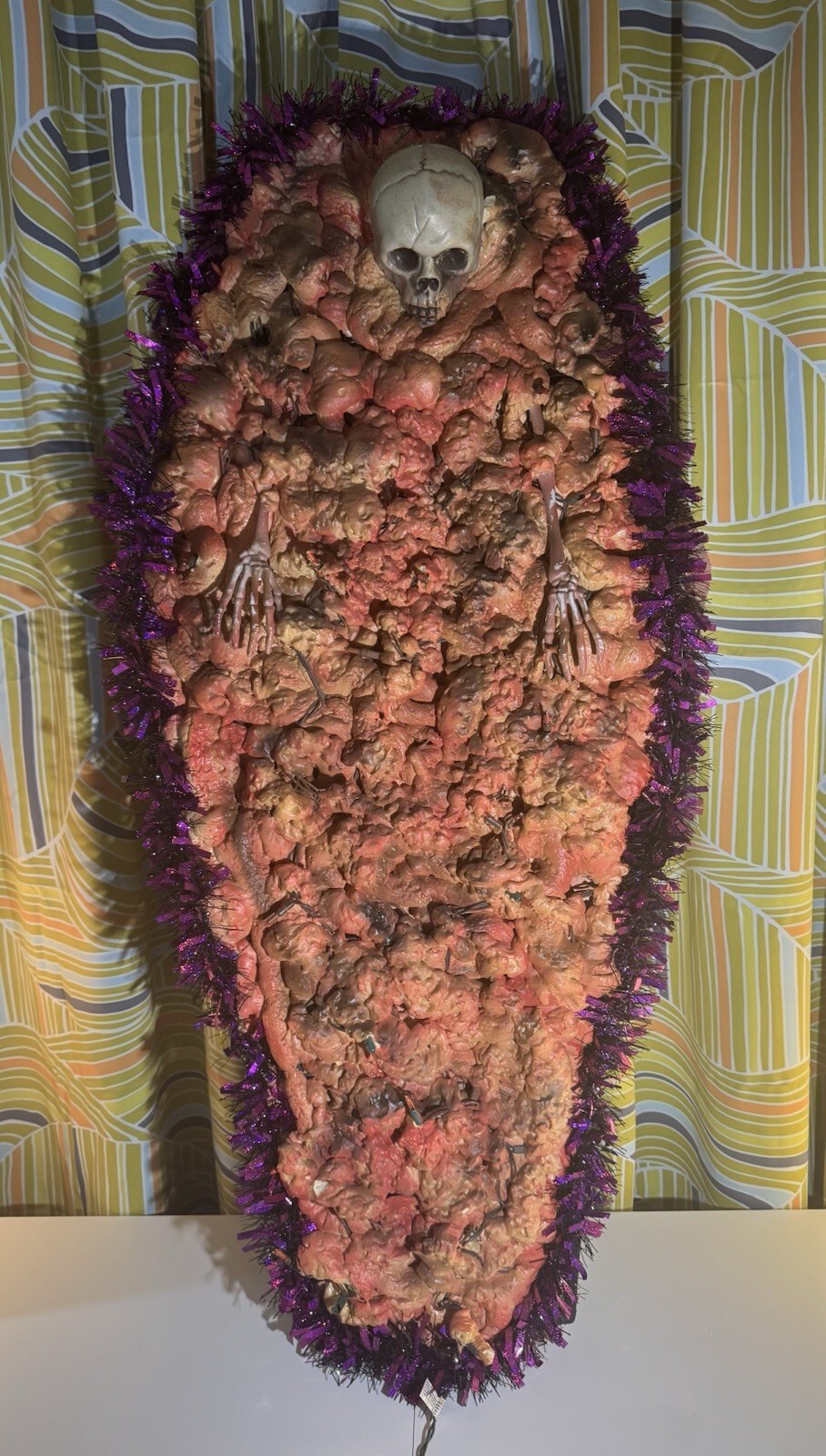 Giant 4 foot Halloween haunted house, salvage prop, large plastic coffin vintage, some kind of foam with plastic bones and a skull and lights, a little bit of wear to the foam, as shown, this was used as part of a Michael Myers exhibit in a Halloween haunted house, most of the lights work, the plywood piece sits on top of the coffin, vintage item, sold as is, as pictured, condition as pictured, no local pick ups, shipping only, ships professionally packed within three business days.