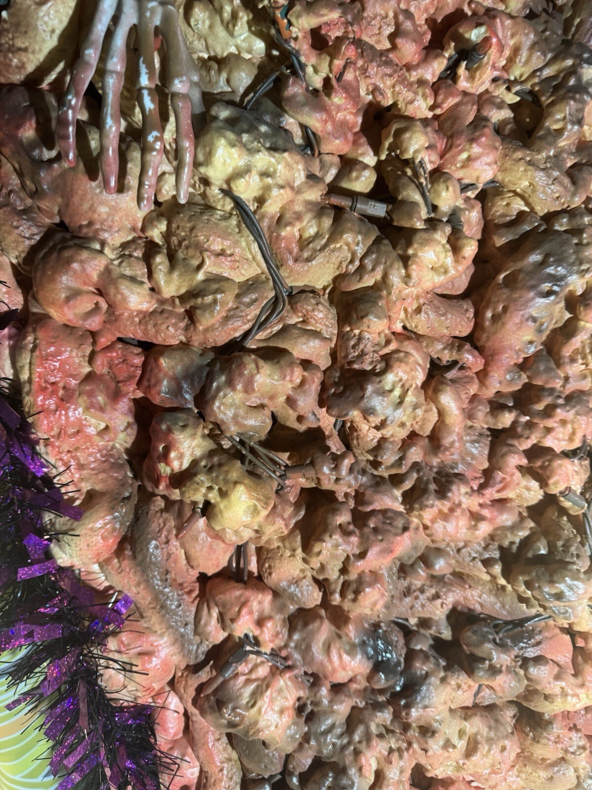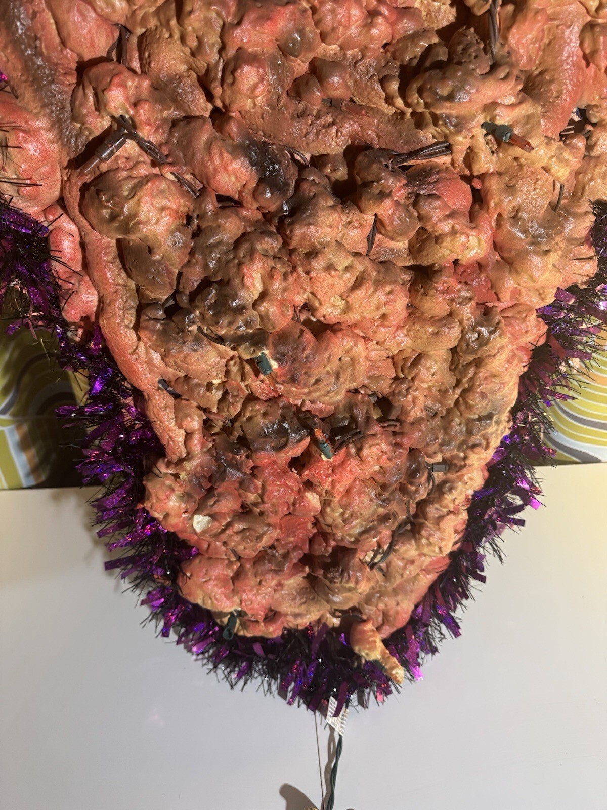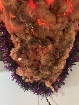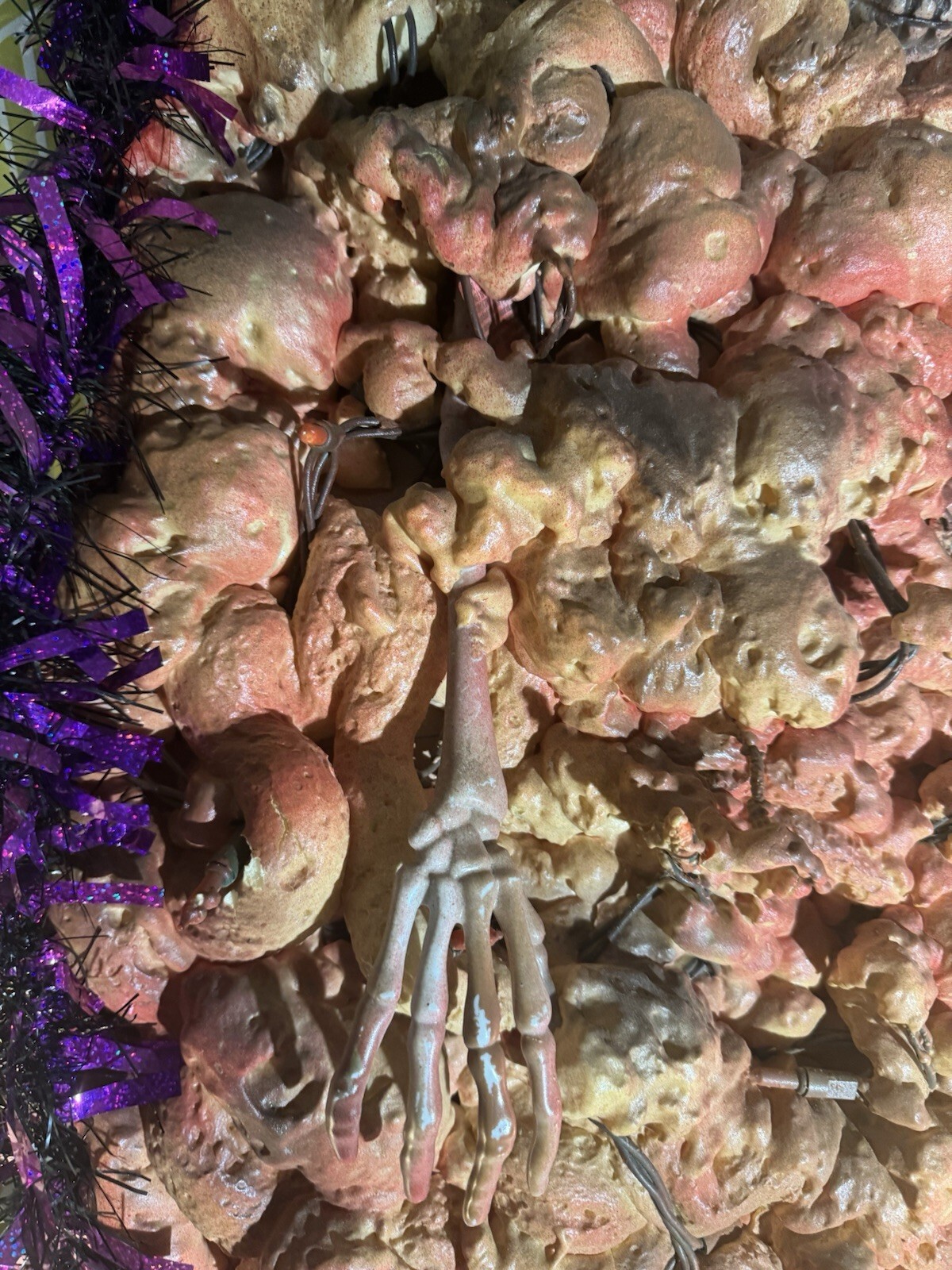 Giant 4 foot Halloween haunted house, salvage prop, large plastic coffin vintage, some kind of foam with plastic bones and a skull and lights, a little bit of wear to the foam, as shown, this was used as part of a Michael Myers exhibit in a Halloween haunted house, most of the lights work, the plywood piece sits on top of the coffin, vintage item, sold as is, as pictured, condition as pictured, no local pick ups, shipping only, ships professionally packed within three business days.