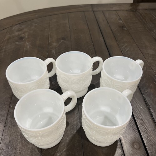 Vintage Hazel Atlas Hazelware White Milk Glass Scroll & Dots Embossed Mugs (5)