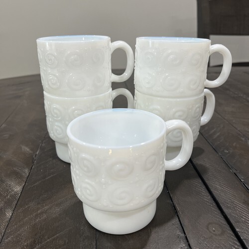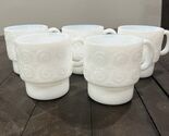 Primary image for Vintage Hazel Atlas Hazelware White Milk Glass Scroll & Dots Embossed Mugs (5)