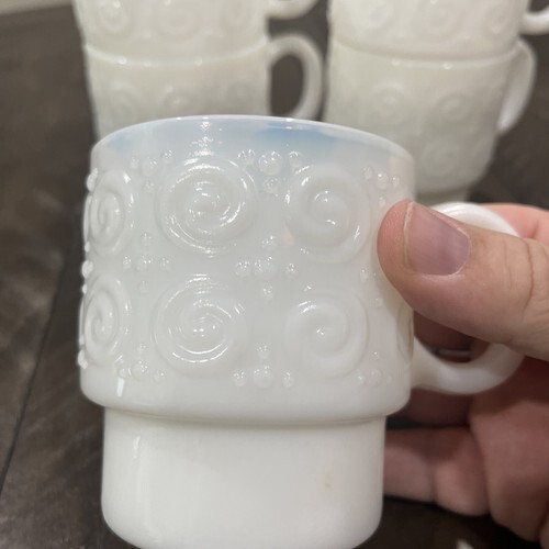 Vintage Hazel Atlas Hazelware White Milk Glass Scroll Dots Embossed Mugs (5).