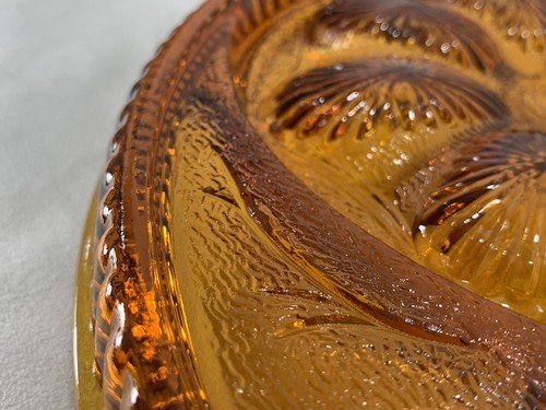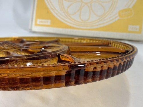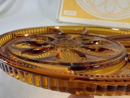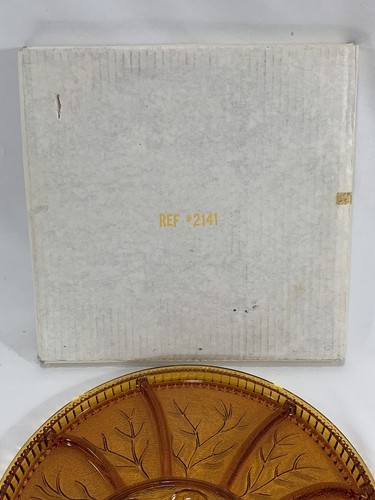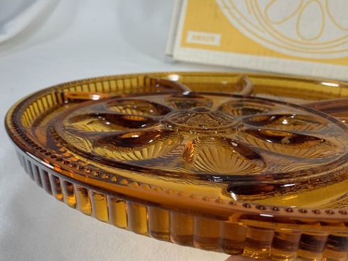 Vintage Indiana Amber Round Divided Glass Deviled Egg/Relish Dish W/Original Box