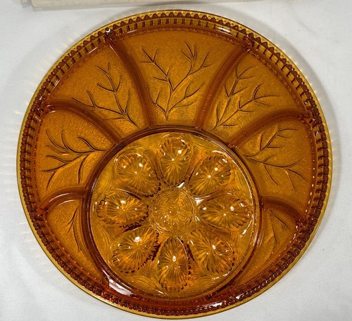 This is a really nice deviled egg/relish tray sure to present your horsd'oeuvres in a elegant way. This is made by Indiana glass, and is a amber in color. Has been well taken care of, and in great shape! I take pride in my pictures, and are a valuable extension of my description. Please take time to see the product fully. Buy with confidence! All items are packaged with great care and shipped next day, excluding any weekends and holidays. I will combine shipping whenever possible as long as the products can be safely packed together. Please be aware, if you have a PO Box, you may receive an additional invoice to cover any additional shipping costs. Please remember to leave feedback, it helps to keep good sellers . International Buyers: We do not mark merchandise as a gift or below value due to it being against US and International Regulations. All custom fees and duties are the responsibility of the buyer. Seller is not responsible for any package held by Customs. If returns are accepted. Must be returned in the same condition as received and in same or similar packaging.