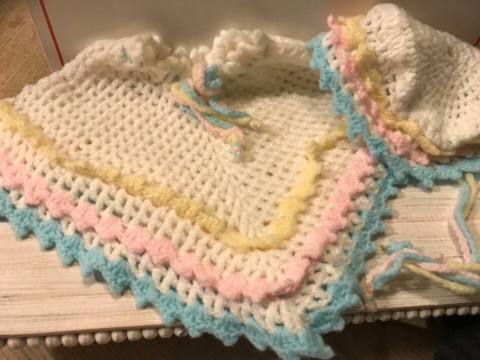 VINTAGE INFANT BABY CROCHETED PONCHO CAP BONNET NEVER WORN BEAUTIFUL