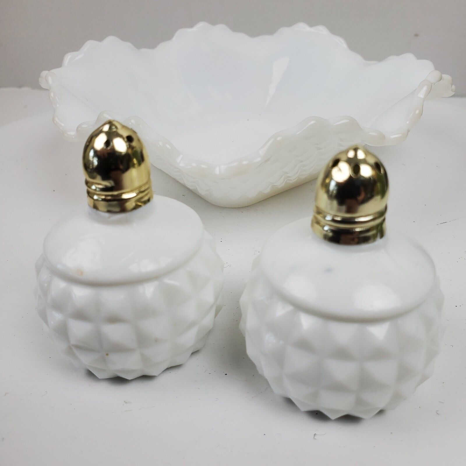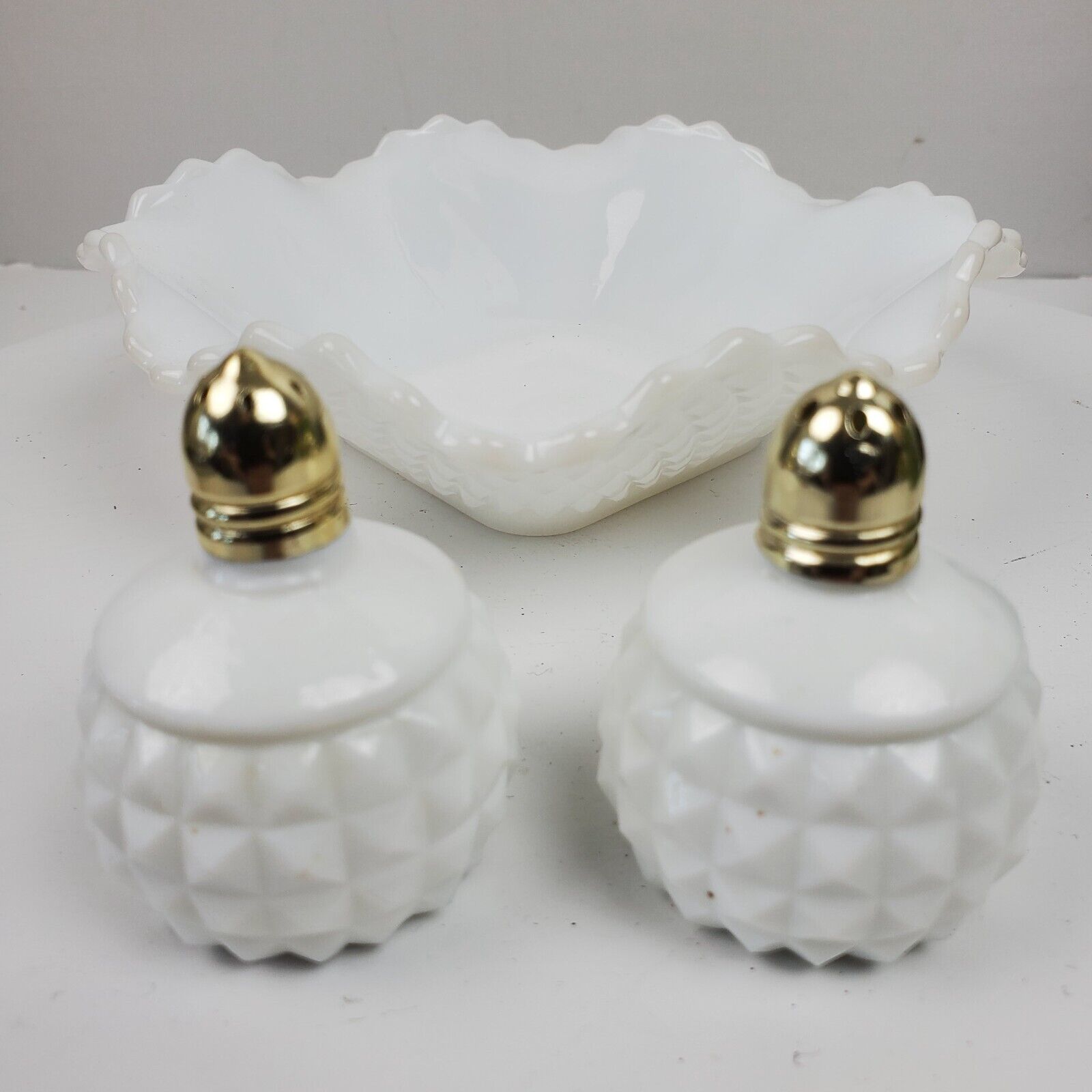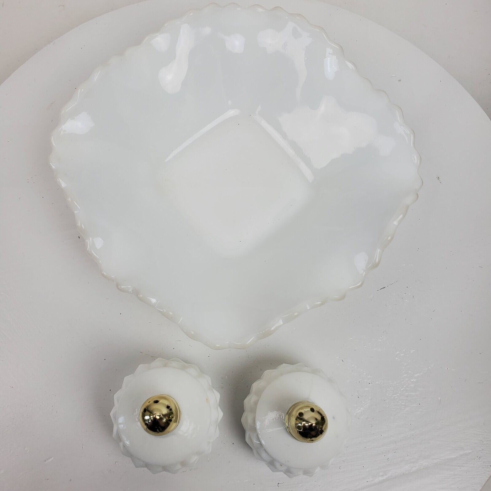 - Vintage Japan Milk Glass Bowl 6 Inch w/ Salt Pepper Set