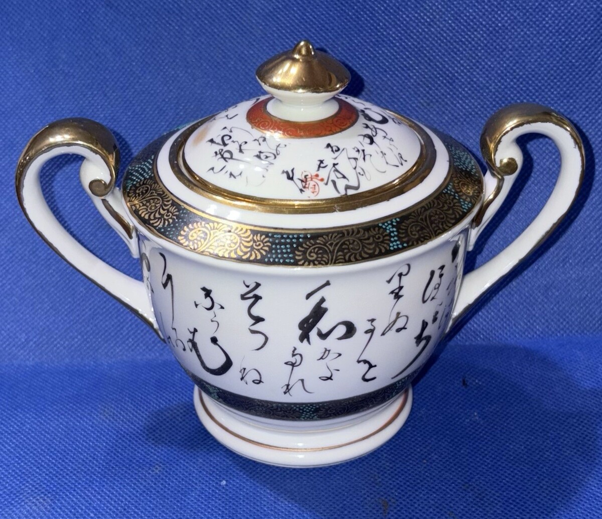 Vintage Japanese Kutani Sugar Bowl with Lid – Gold & Calligraphy Porcelain