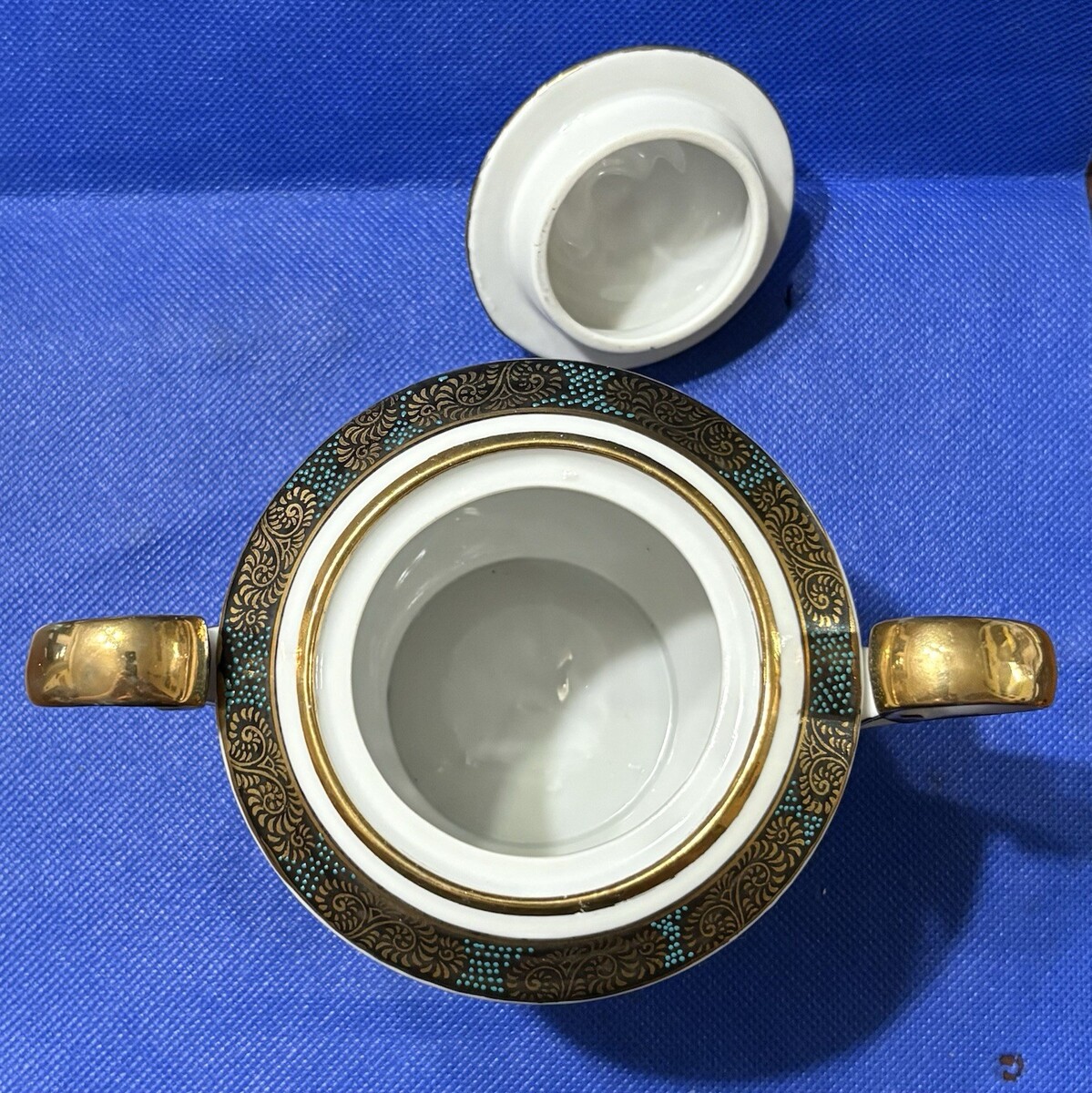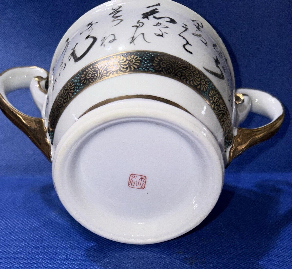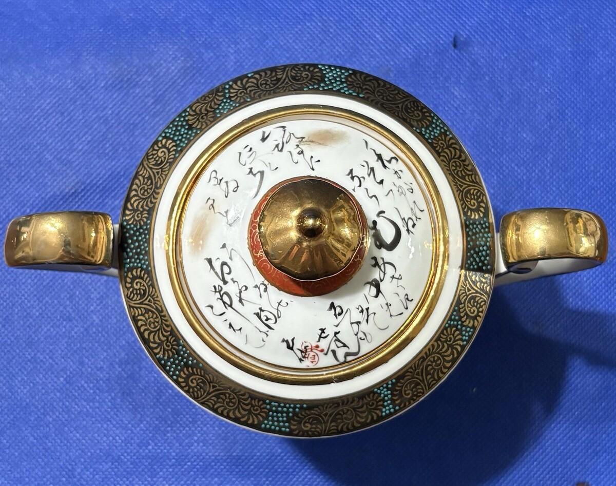 Condition Pre-owned. No cracks or structural damage. Lid fits properly. Shipped within one day of payment. ? Description Beautiful vintage Japanese porcelain sugar bowl in the Kutani style, featuring hand-painted calligraphy characters, ornate gold detailing, raised turquoise enamel beading, and two gilt handles. Matching hallmark stamp on the base. Displays exceptionally well and pairs with the matching creamer from the same set. Approx. 4.75? tall to finial. Perfect for collectors of Kutani, Satsuma-style, Asian export porcelain, or Japanese calligraphy art. ? Item Specifics: ? Type: Sugar Bowl w/ Lid ? Material: Porcelain ? Style: Kutani / Japanese Calligraphy ? Features: Hand-painted, Gold Trim, Double Handles, Lidded ? Country/Region of Origin: Japan (style; maker unknown) ? Color: White with gold, black script, turquoise enamel dots ? Height: ~4.75? ? Vintage: Yes ? Shipping Seller Info: Ships fast ? 1-business-day handling. 30-day returns, USA seller. ? Search Keywords: kutani sugar bowl japanese calligraphy porcelain gold gilt enamel satsuma asian vintage tea set lidded bowl japan script kutani ware