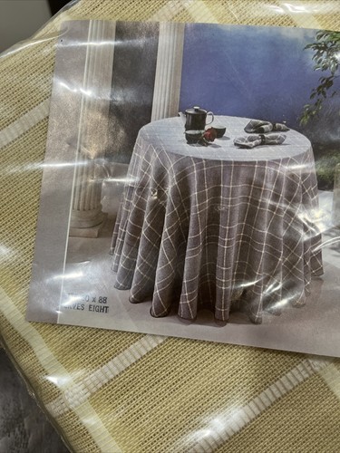 - Vintage KEMP & BEATLEY Tan Window Pane Tablecloth 60 X 88 Polyester Acrylic NOS