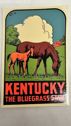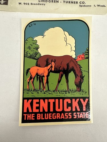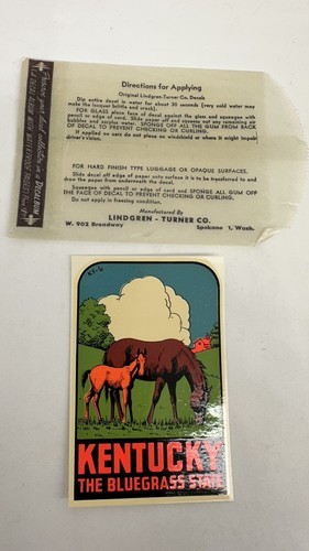 This product is a vintage luggage decal or window transfer from the 1950s featuring the Kentucky Bluegrass State design by Lindgren Turner. It is multi-colored and was manufactured in the United States. The decal falls under the Collectibles and Automobilia categories and is perfect for transportation enthusiasts.