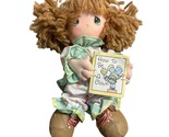 Adorable vintage collectible doll with charming details and vibrant colors, perfect for display or gifting. Includes attached mini book for added character. ? Made of soft cloth material ? Features beige yarn hair styled in pigtails ? Detailed outfit with pink hearts and green trim ? Includes sewn-on mini book accessory ? Measures approximately 13 inches tall Light wear consistent with age, no visible tears or stains. Approximately 13 inches tall from head to toe. Size: 13" Condition: Pre-Owned Like New