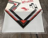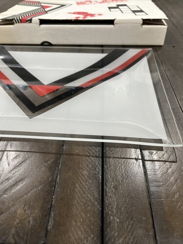 This is a vintage LE Smith serving tray from the 1980s, part of The Studio Collection. The tray is made of glass and has a retro style with a geometric pattern in red and black. It is a medium-sized rectangular tray, measuring 14 inches in width. The model name is Esprit. The tray is a collectible item and has a vintage feel to it.