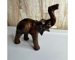 HAS IMPERFECTIONS, SEE PICTURES APPROX. 6.5" HEIGHT AND 5" LENGTH Keywords: elephant statue, leather animal, desk decor, shelf sitter, souvenir, exotic, whimsical, handcrafted, small figurine, table accent, animal collectible, global decor