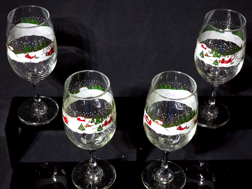 Nice set of 4 Winter Village wine glasses by Libbey in excellent condition. Great color/clarity,