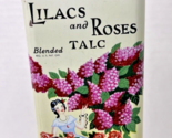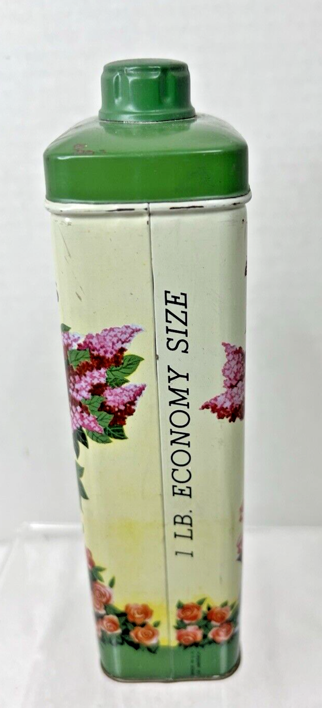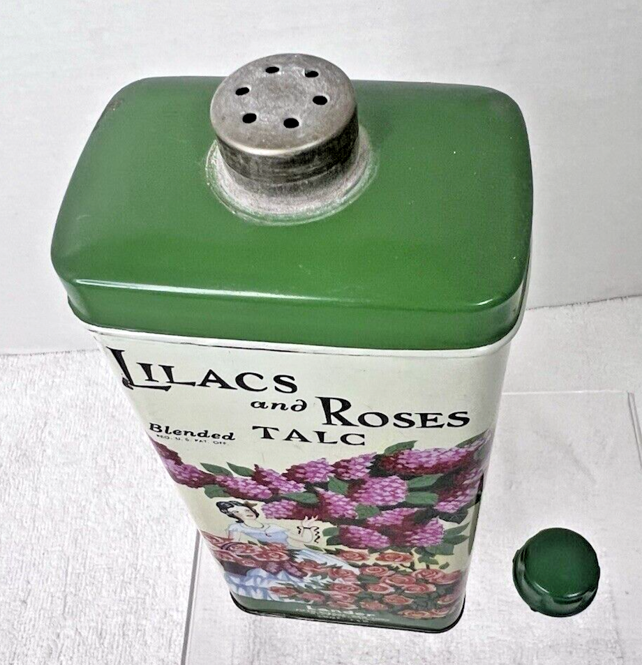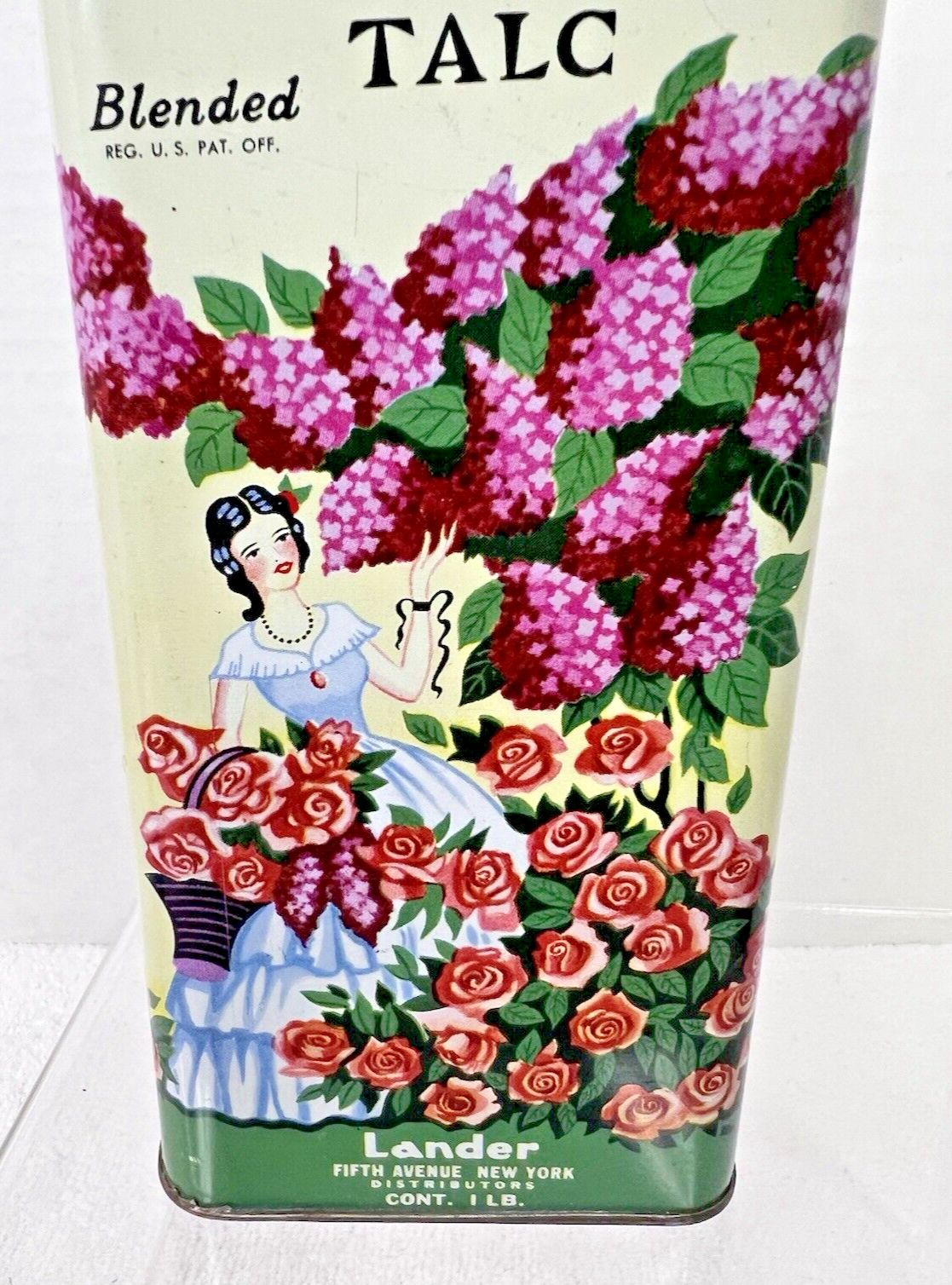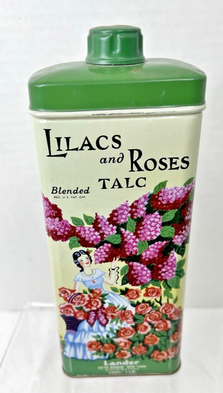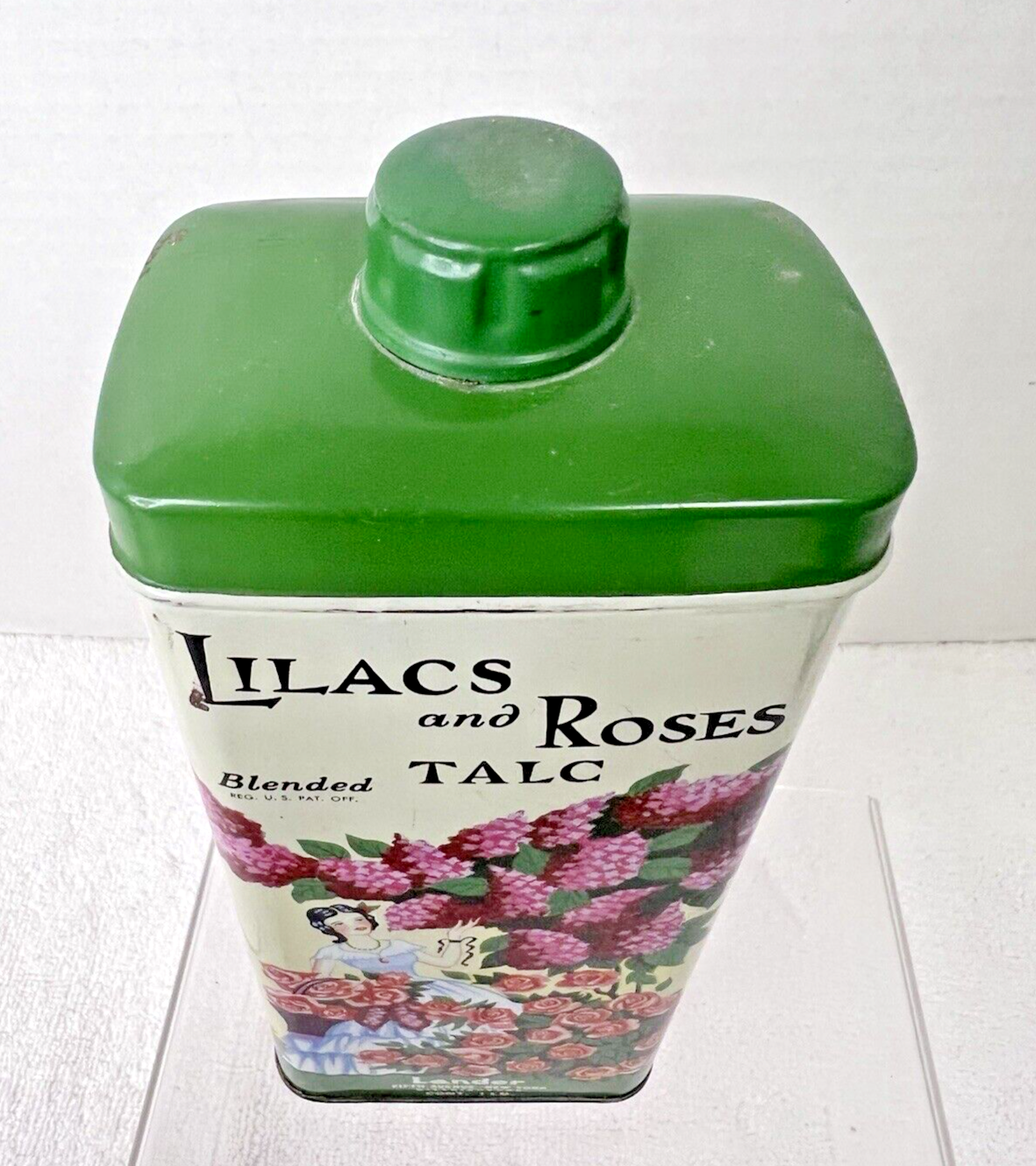 Vintage Lilacs and Roses Talc Tin Lander 1 Pound FULL Great Shape there is some slight paint loss and it might not be 100 % full but it's 95+% full The tin measures 7 3/4 to top of the cap and it is 3 x 2 inches