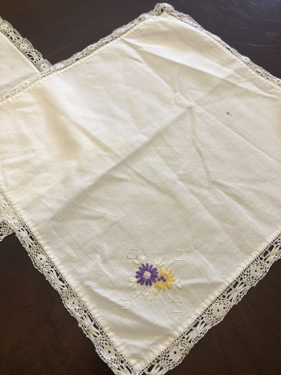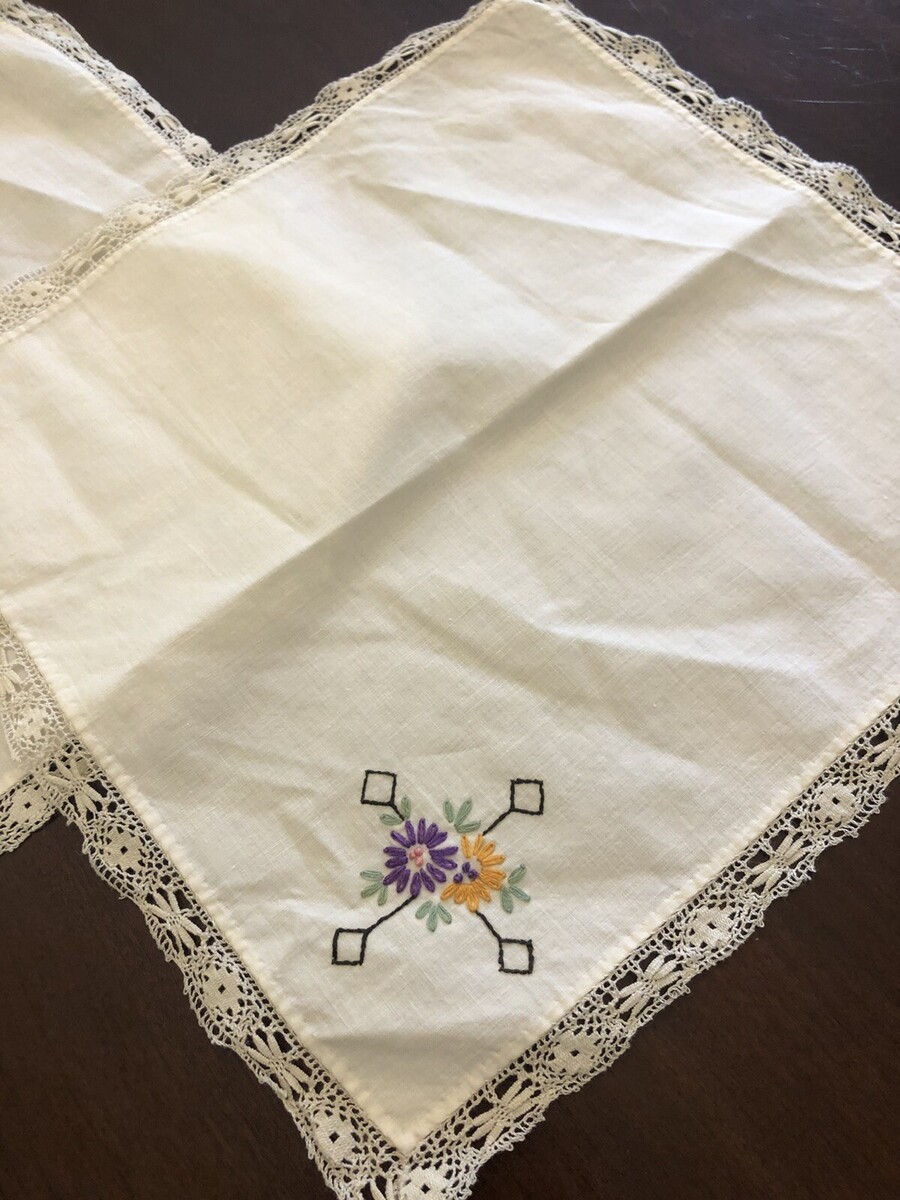 Vintage Linen Embroidered Table Squares (set of 3) 12" x 12", Off White Hand embroidery in gold, purple and green Vintage, lace trim In very good vintage condition. No holes. One small stain. Embroidery is complete and in very good condition. Check out my other items! I am happy to combine shipping and only charge actual shipping charges - NO HANDLING FEES! My goal is always 100% complete customer satisfaction. If you feel your item has arrived "not as described", please contact me to arrange for return/refund before leaving feedback I am a trading assistant. I can sell your items for you! |KRS-AXH|
