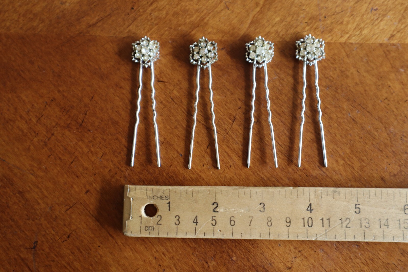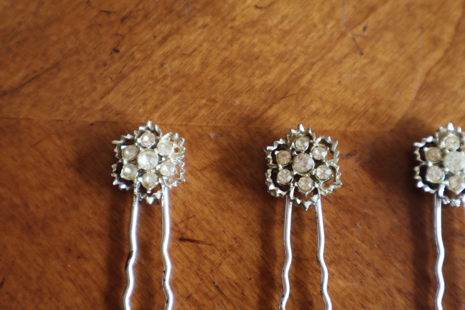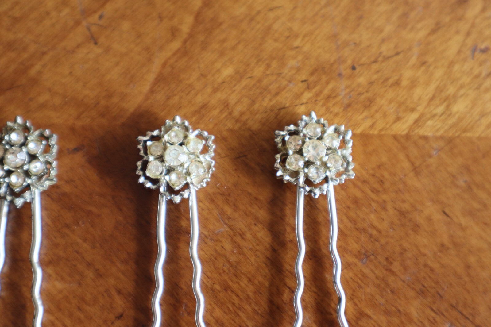 Used condition with some wear and some tarnish (not rust) on the metal parts. The rhinestones on the 4 hairclips are partially discolored but there are no stone missing.