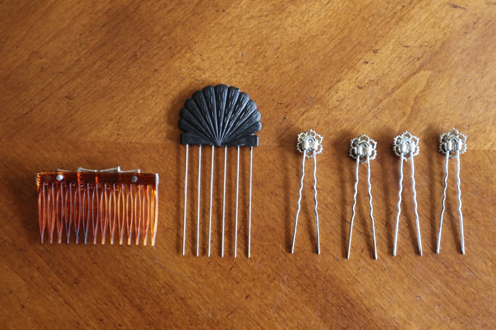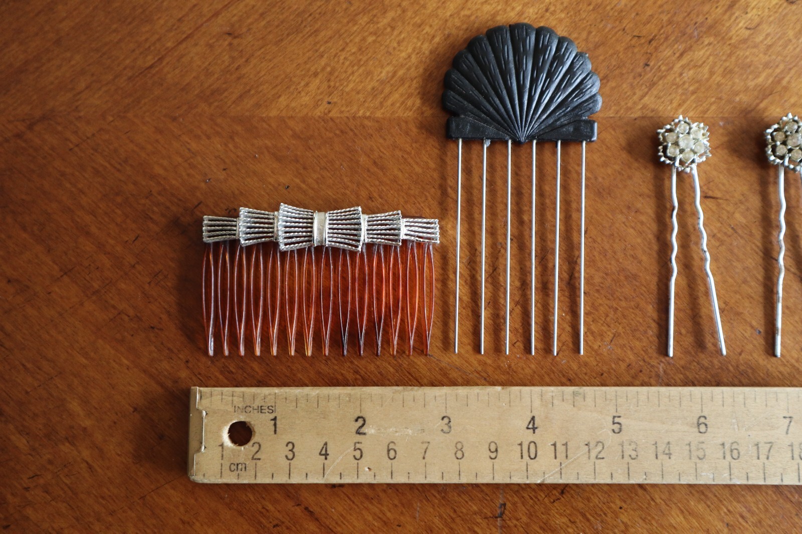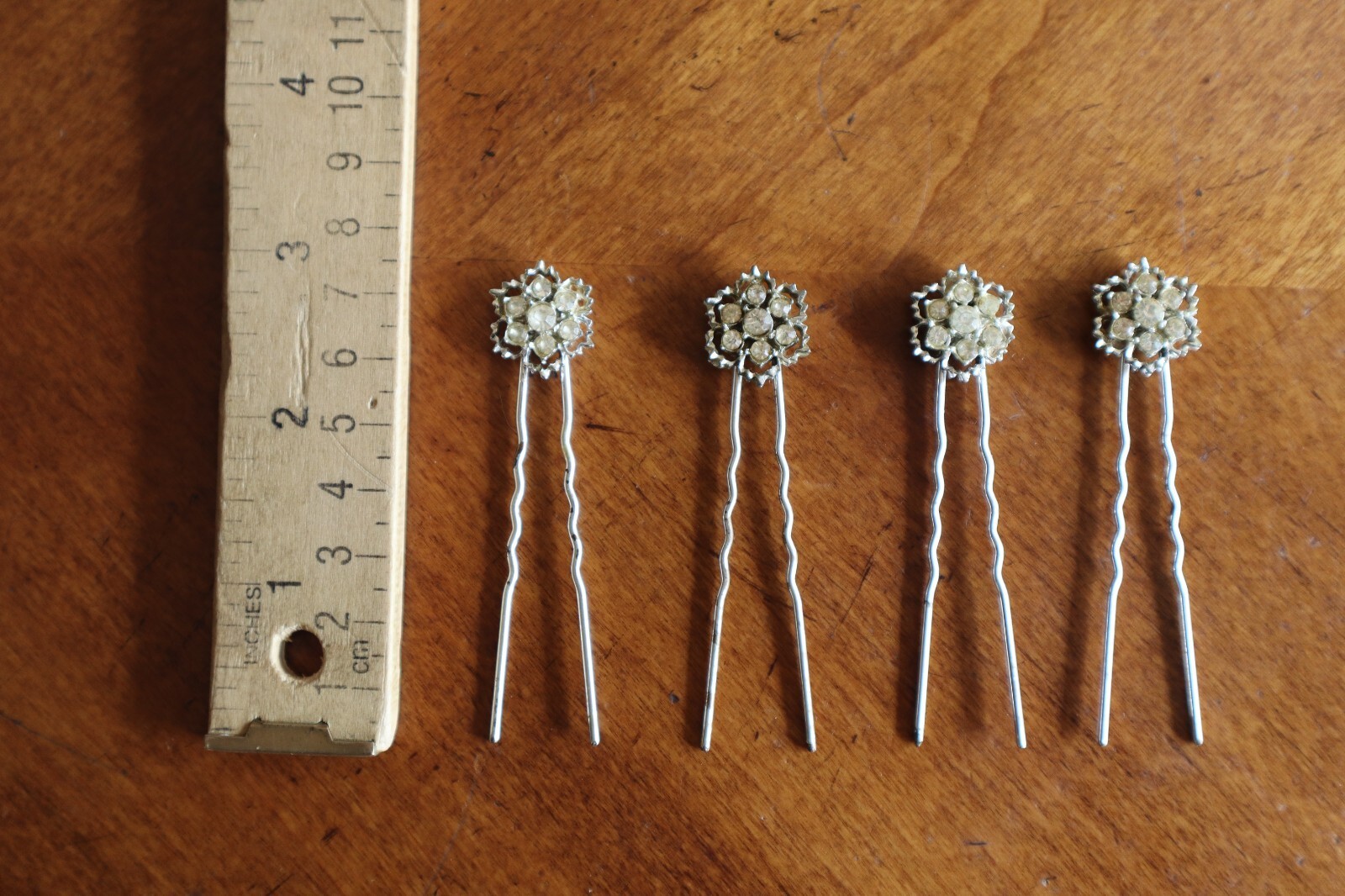 Used condition with some wear and some tarnish (not rust) on the metal parts. The rhinestones on the 4 hairclips are partially discolored but there are no stone missing.