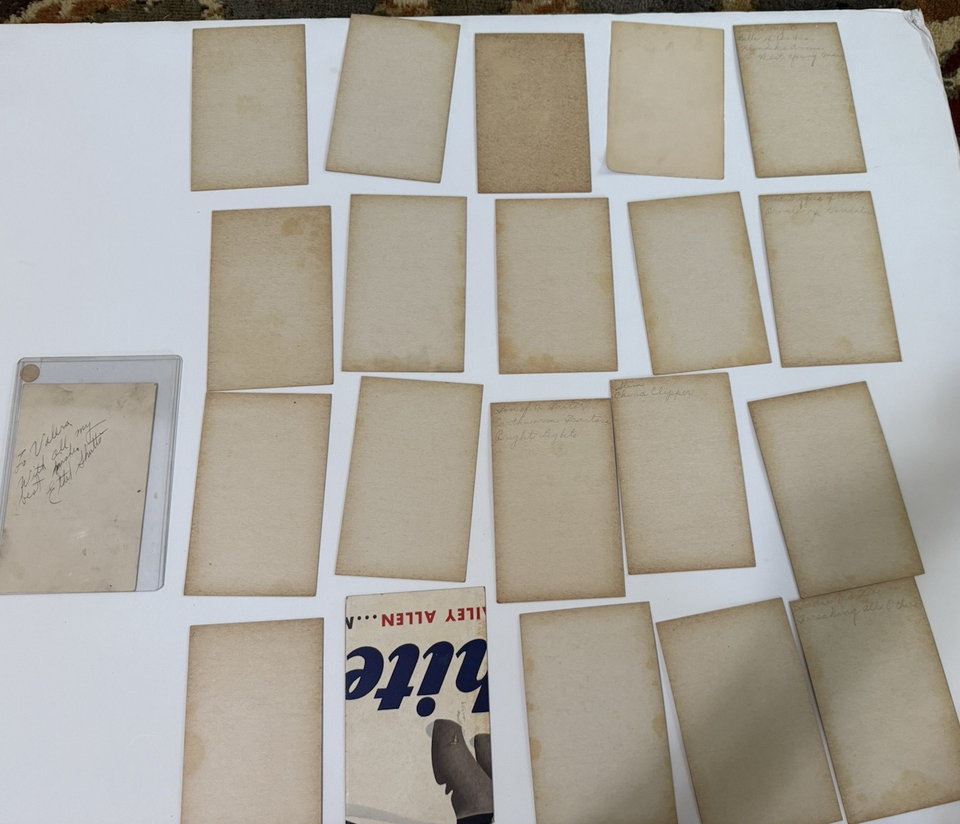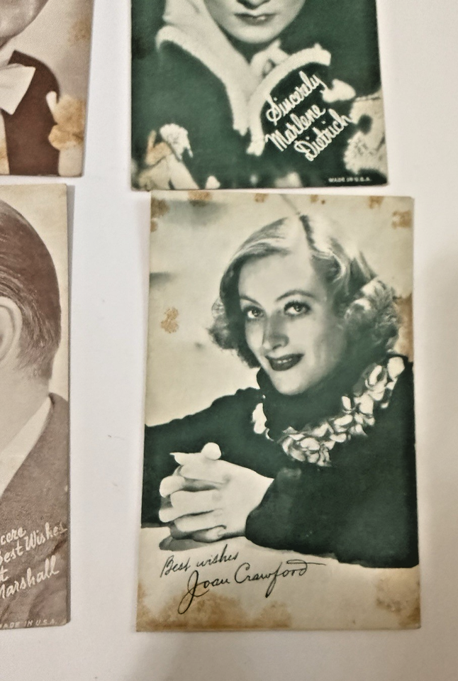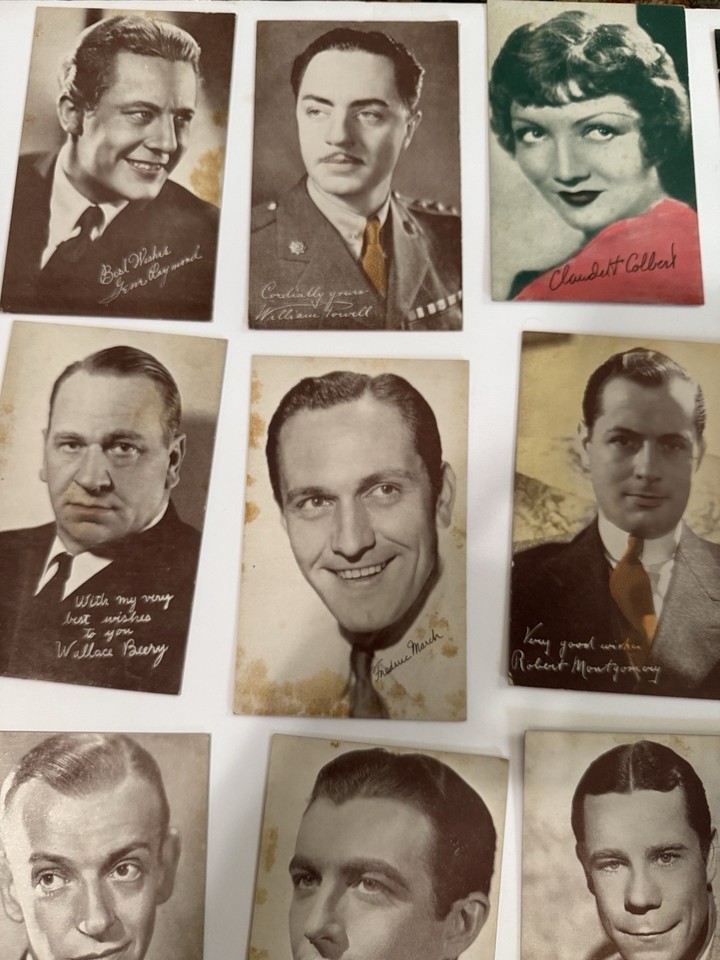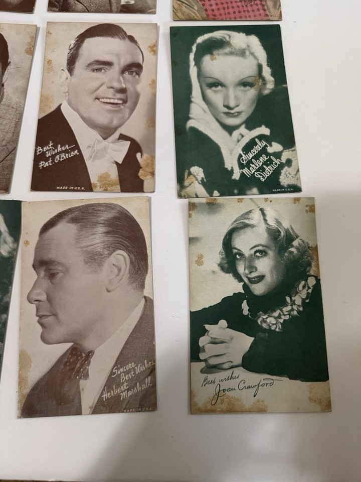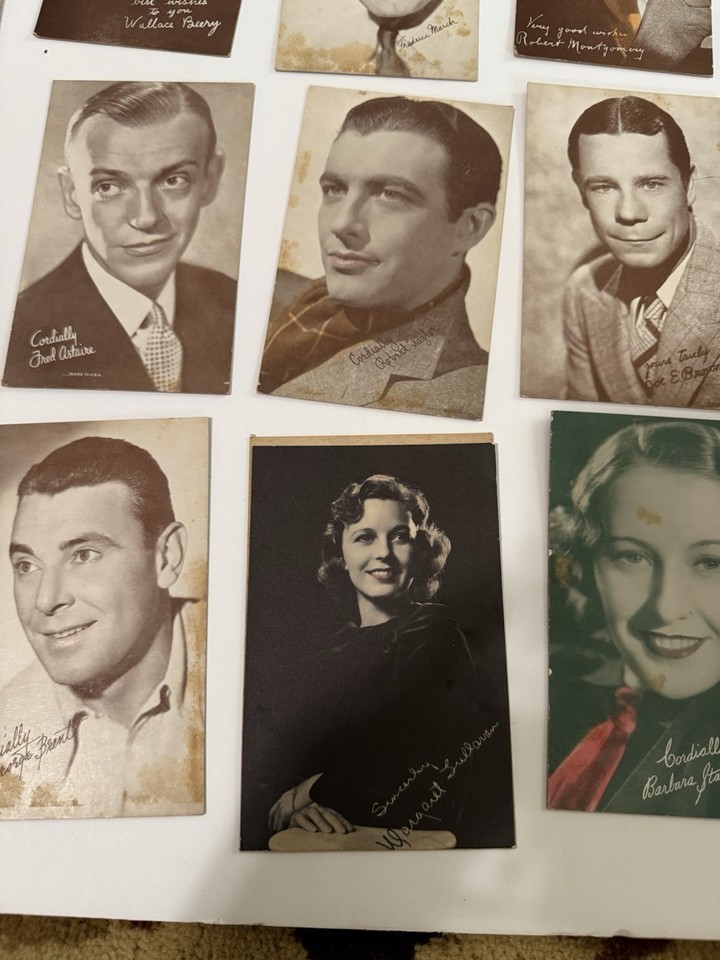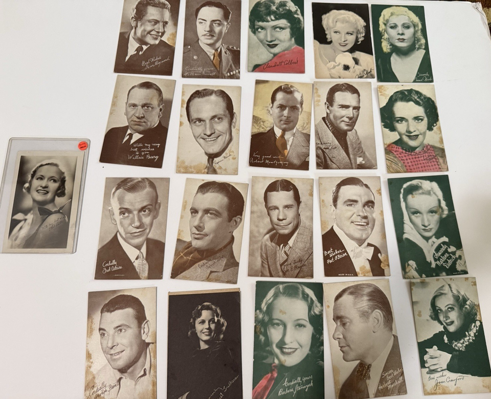 Here are 21 vintage black and white Arcade Cards. Each of a different Hollywood movie star with their facsimile signatures. Each card is 3 3/8" by 5 3/8" - postcard size. All cards are cardboard and good condition. some have spotting but no rips. So, these are not in excellent condition. None are bent.