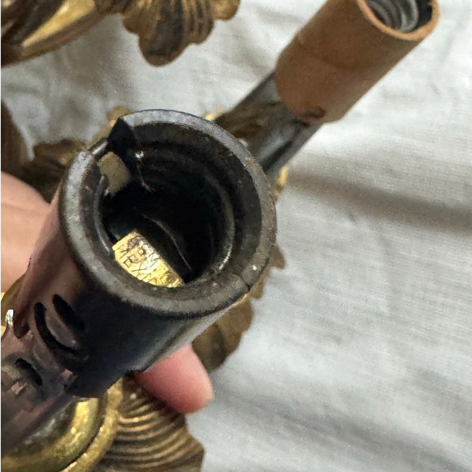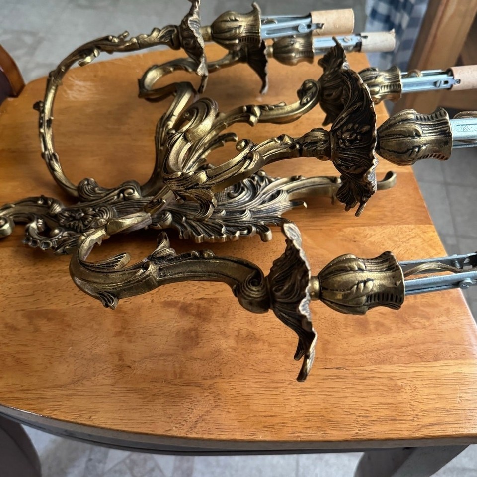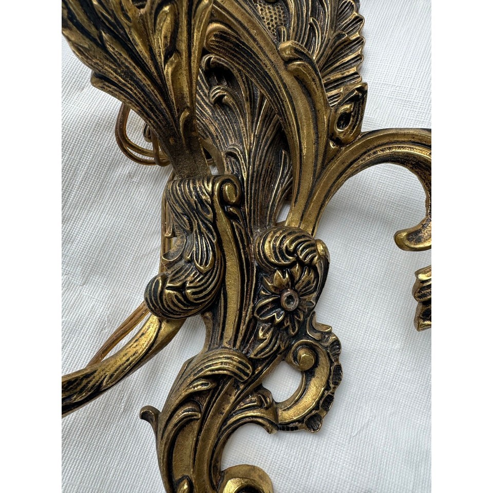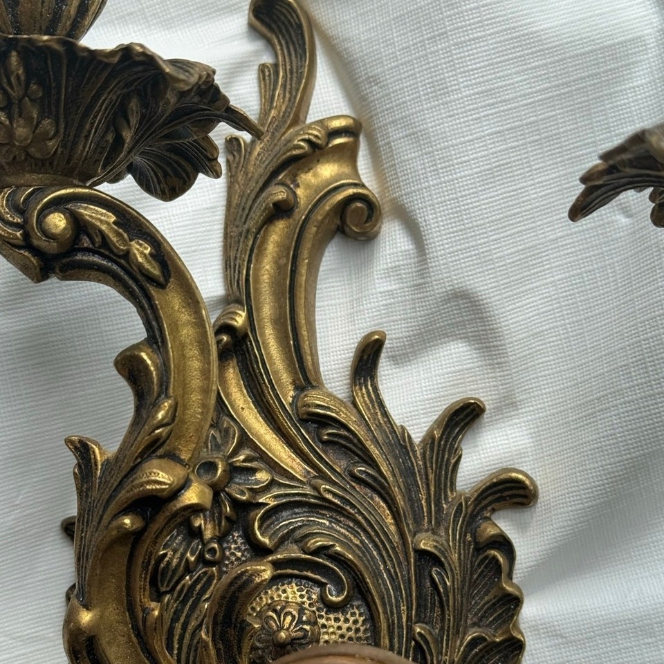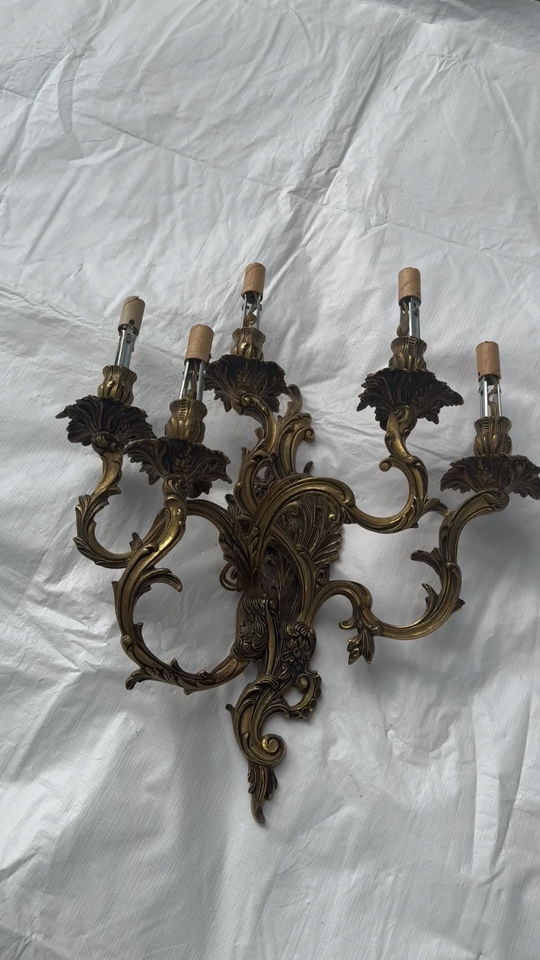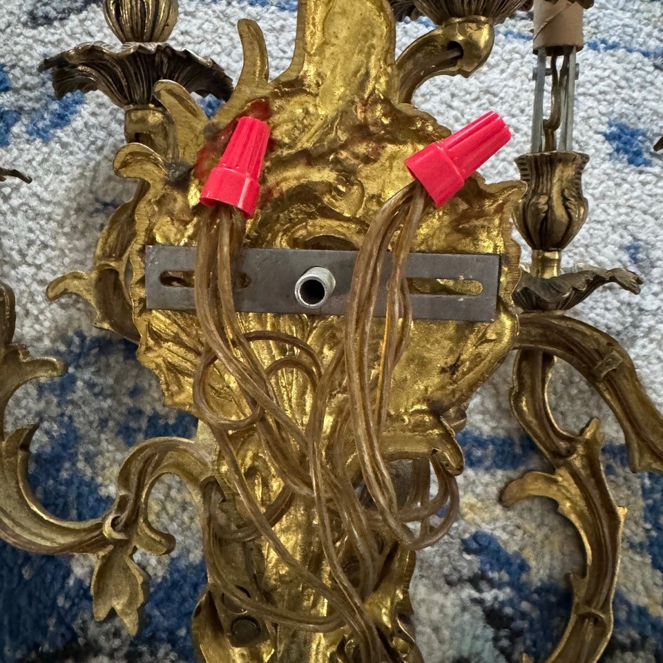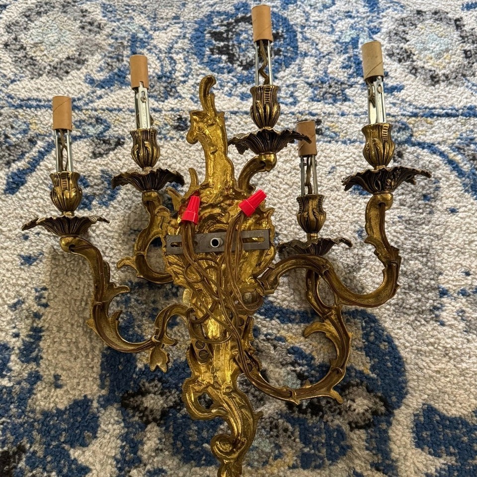 Vintage Louis XV French Style Single 5 Arm Electric Rococo Ornate Wall Sconce FOR PARTS Not in working condition currently, PLEASE BE ADVISED that this electric wall fixture is not wired for use in the USA. It seems to be wired for European 220 volt and will need to be reworked by a a professional electrician for safe use in the USA. No maker marks. Seems to possibly be cast brass or bronze? 18" wide, 20" tall, 7" deep, weighs 6 pounds and 13 ounces, "candle" portion is about 5" tall Missing the white plastic candle covers and the light bulbs. Untested. Of course the buyer could choose to remove the wiring and use it as a candelabra, possibly needing to make some modifications for candle use. expect vintage wear LISTING IS FOR A SINGLE SCONCE.