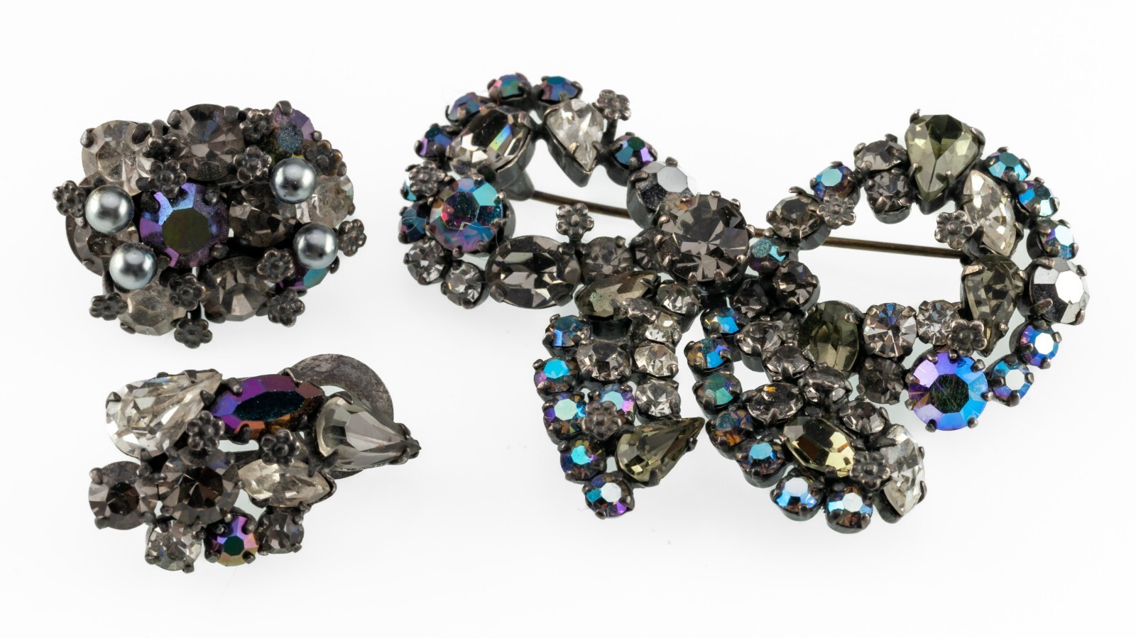 Features Multi-Colored Rhinestones Set in Brooch and Clip-On Earrings