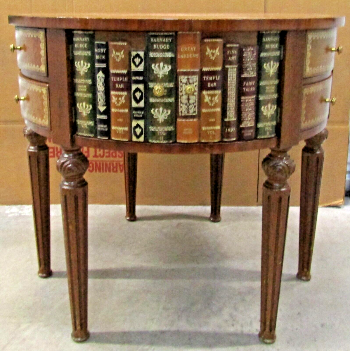 The Vintage Maitland Smith Signature Tromp l'oeil Center Drum Table is a unique accent table made of wood and leather. With a height of 26.5 inches and a square base measuring 30 inches on each side, this antique piece is sure to add a touch of elegance to any living space. The intricate tooled leather detailing and tromp l'oeil design make it a standout piece in any room. Perfect for displaying decorative items or serving as a functional table, this Maitland Smith creation is a timeless addition to any home. Vintage Maitland Smith Signature Tromp l'oeil Center Drum Table Tooled Leather This is a beautiful round table by Maitland-Smith. It has a leather top and tooled leather faux (trompe l'oeil ) book designs on the periphery. There are 3 sets of double doors that open to storage, and 3 sets of 2 drawers. The 6 mahogany legs are carved. The table is about 30" in diameter and 28.5" high. The previous owner had drilled a hole in the center top for a lamp cord. You can easily repair this or leave it for your own lamp. Fort Lauderdale waterfront estate purchase.