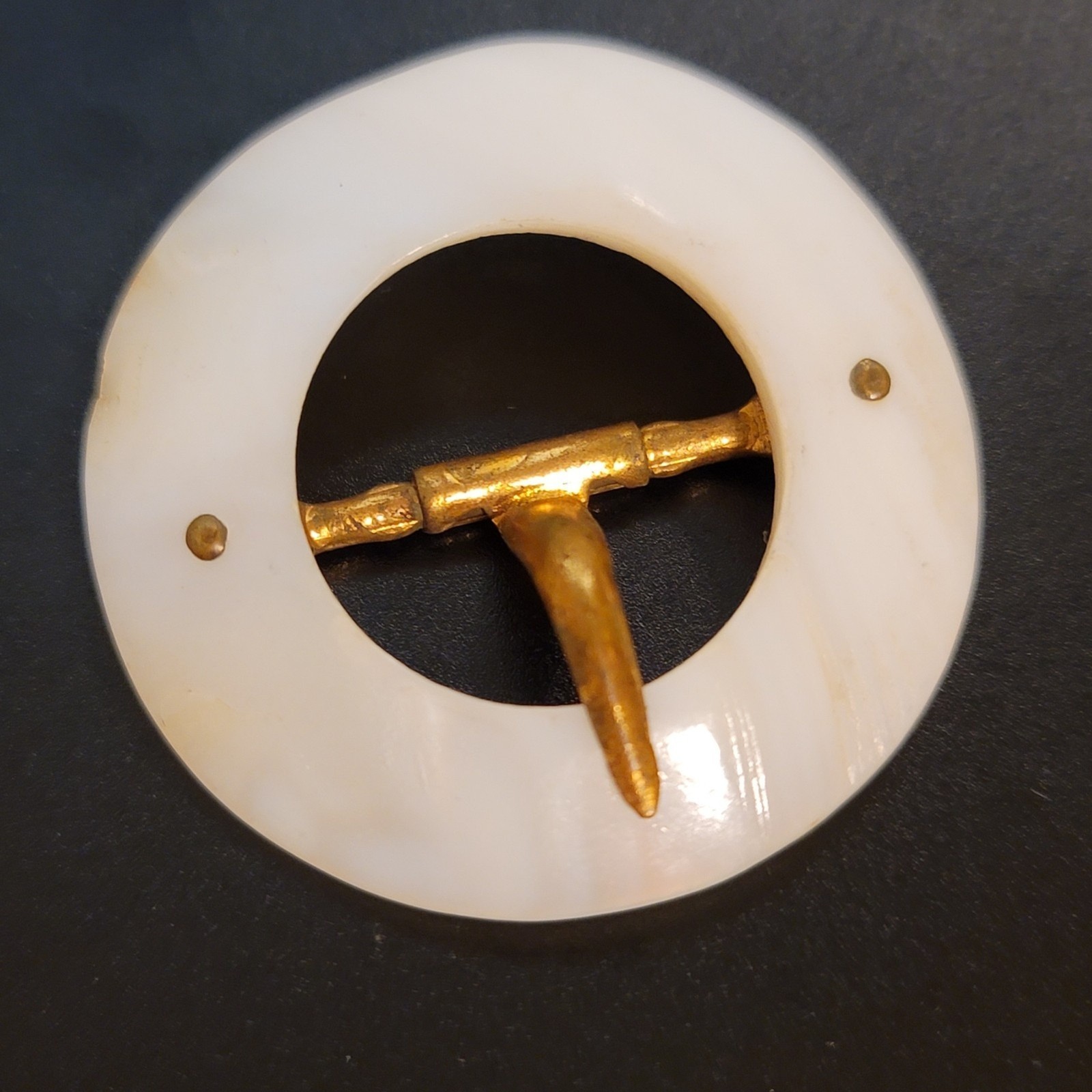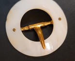 Vintage Mother Of Pearl Buckle 1.5" diameter, in good preowned condition. Has some signs of wear due to age. Metal is possibly brass or copper