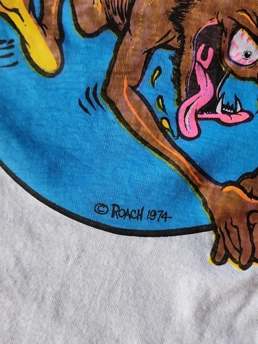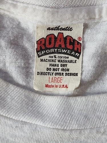 UP FOR SALE: 1974 Vintage ROACH SPORTSWEAR Tag T-Shirt Original Roach Transfer Large USA Made This is an Original 100% Authentic ROACH SPORTWEAR Tag T-shirt with an Original ROACH Transfer--Certified Muff Buster. It does not look to have been worn much and was found in the VERY BACK of an Estate closet on a hanger. I have washed this by hand and removed most all of any yellowing and "closet dust, aging" and laid it out to dry flat. Simply AMAZING 42 YEAR OLD T-SHIRT PLEASE REFER TO ALL PHOTOS FOR A BETTER VISUAL DESCRIPTION OF THE ITEM *Vintage and secondhand items may have flaws. Please review item(s), description and picture(s). I do my best to research and describe the items accurately, but I am not an expert on all of the items I sell. Unless specified in the listing, all items are sold AS-IS AS-SEEN in photos* All of My Items Come from a Smoke Free Home and have been cleaned per's standards I do Ship everyday Monday - Saturday Feel Free to Visit My Store and Browse Through My Other Listings as I am happy to combine shipping for you. Please contact me with any issues prior to leaving negative/neutral feedback or low detail ratings, as I will always do my best to solve any problems that may come up! If you have any further questions, please feel free to message me Any props that are used in the taking of the photos are not included. Only the item/items in the title of the listings are being sold