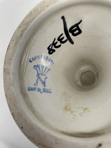 The round basket has a base width of 3.5 inches and an item length and width of 5.5 inches. It stands at a height of 4.5 inches and is entirely handmade. The basket is part of the Capodimonte product line and has a theme of Basket Roses. It is a beautiful and unique addition to any collection.